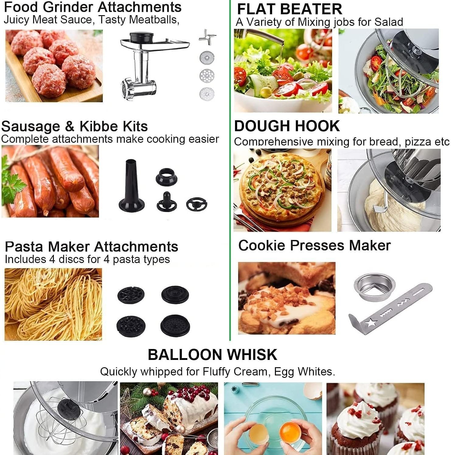 【5 Variable Speed Settings 】With handy 5-speed controls, Aifeel stand mixers achieve multipurpose and varieties of recipes. Kneading Dough Hook: at speed 1-2 for kneading dough for cookie or baking , Make Noodles / Flat Beater: at speed 3-4 for mixing salad or using pasta maker attachment,Mince Meat and Wire Whip: at speed 5 for whisking egg or grinding meat or making sausage.