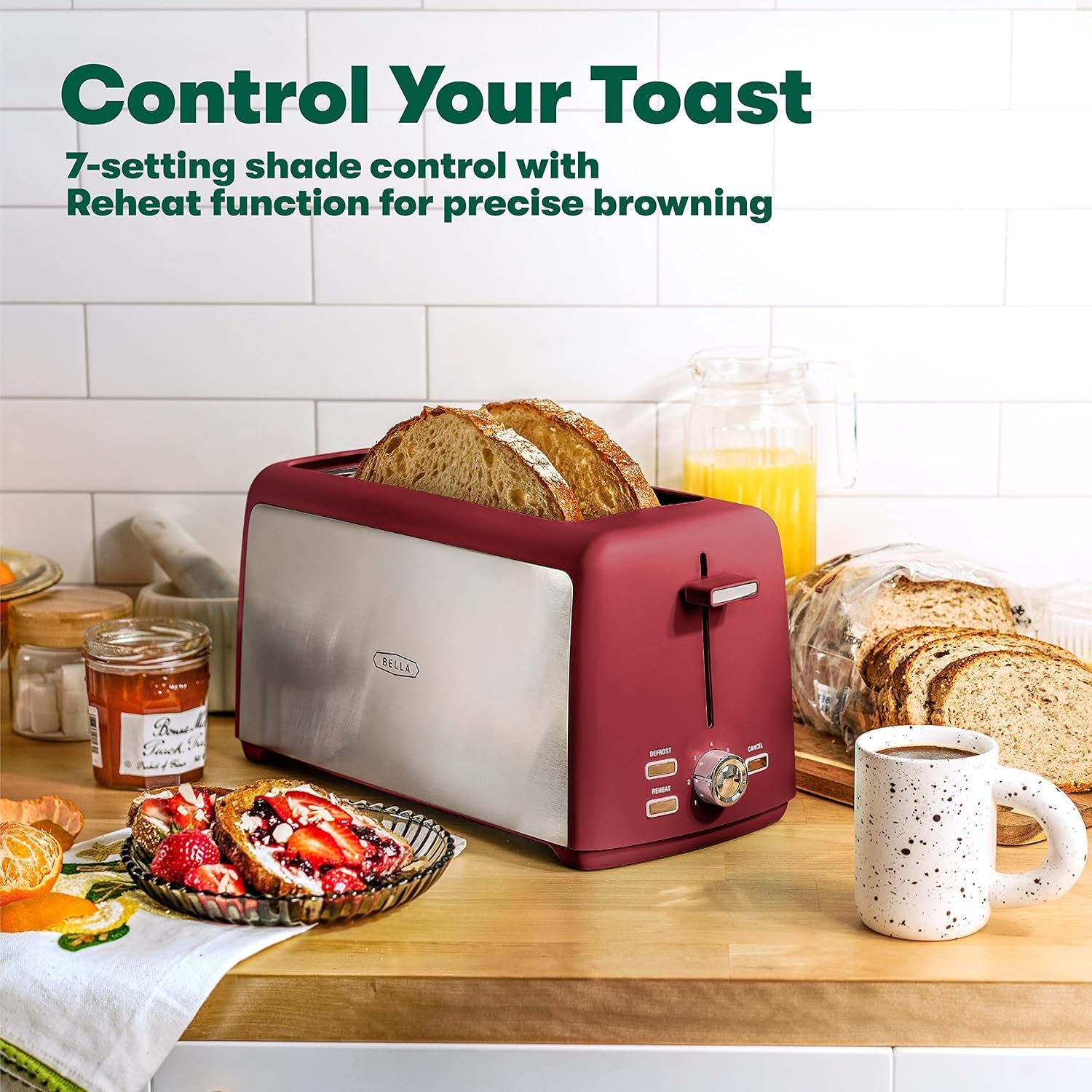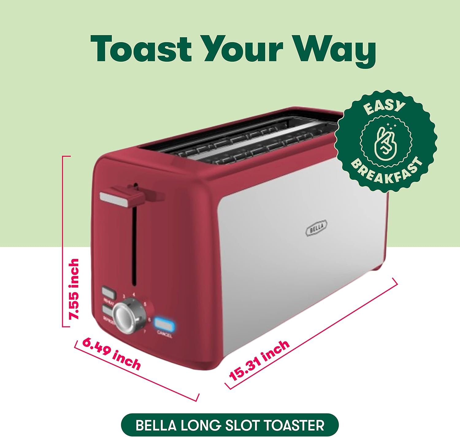 BELLA 4 Slice Toaster, Long Slot & Removable Crumb Tray, 7 Shading Options with Auto Shut Off, Cancel & Reheat Button, Toast Bread & Bagel, Stainless Steel & Red