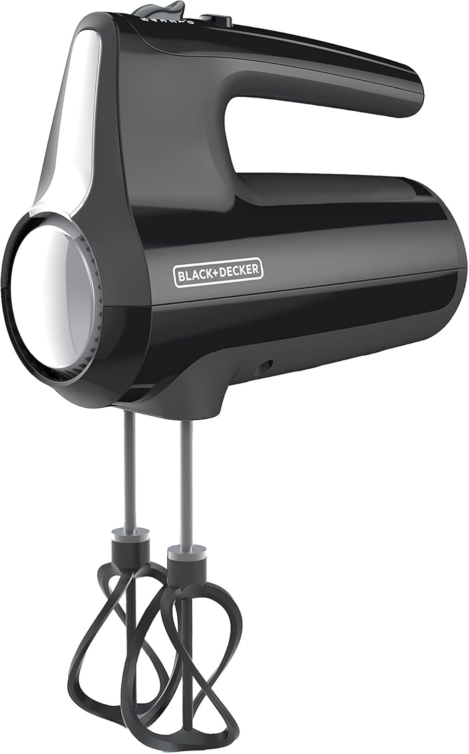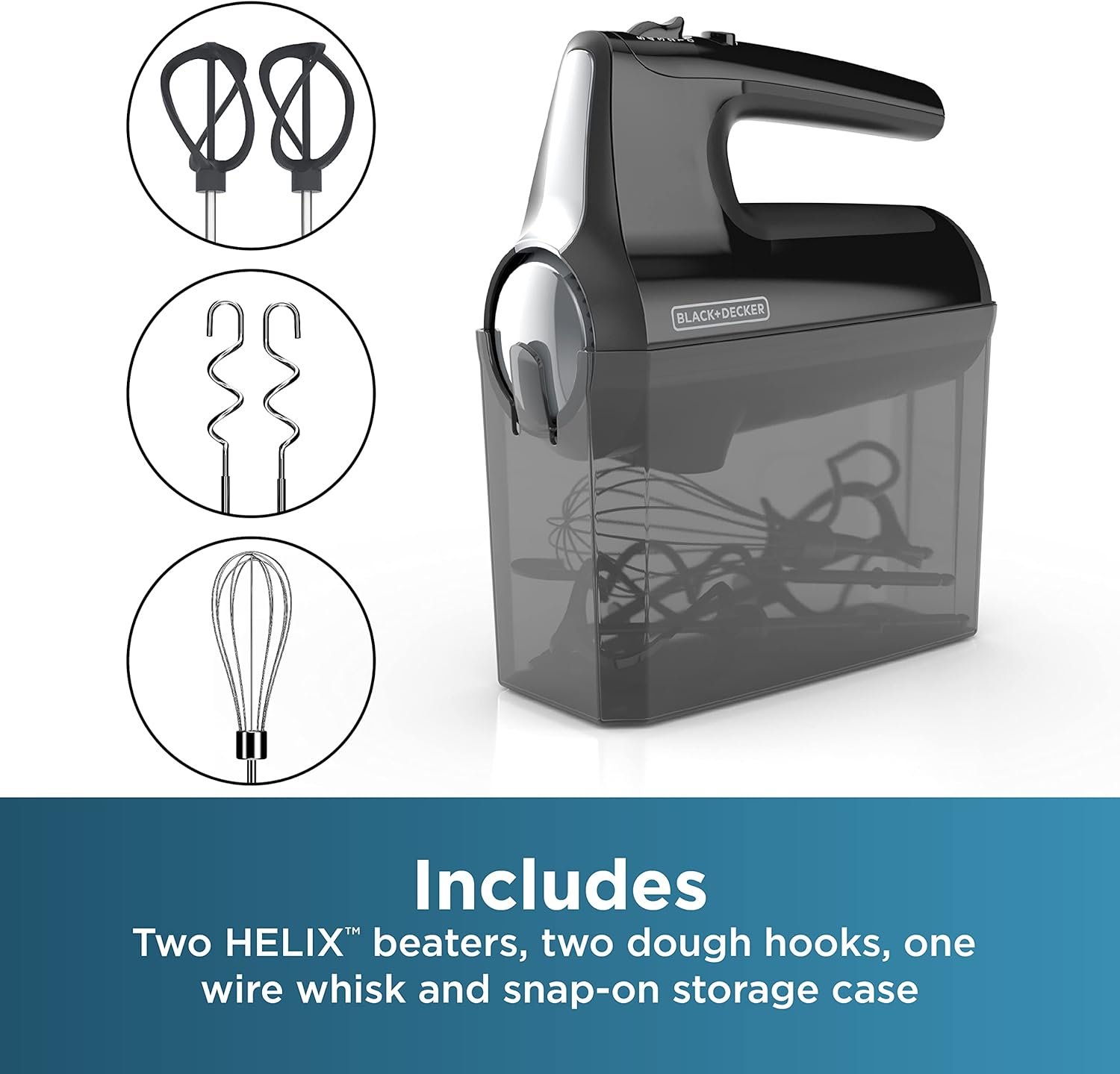 BLACK+DECKER 5 Speed Electric Hand Held Mixer, HELIX beaters, Whisk, and Dough Hook Attachments, Turbo Boost, Snap-On Storage Case