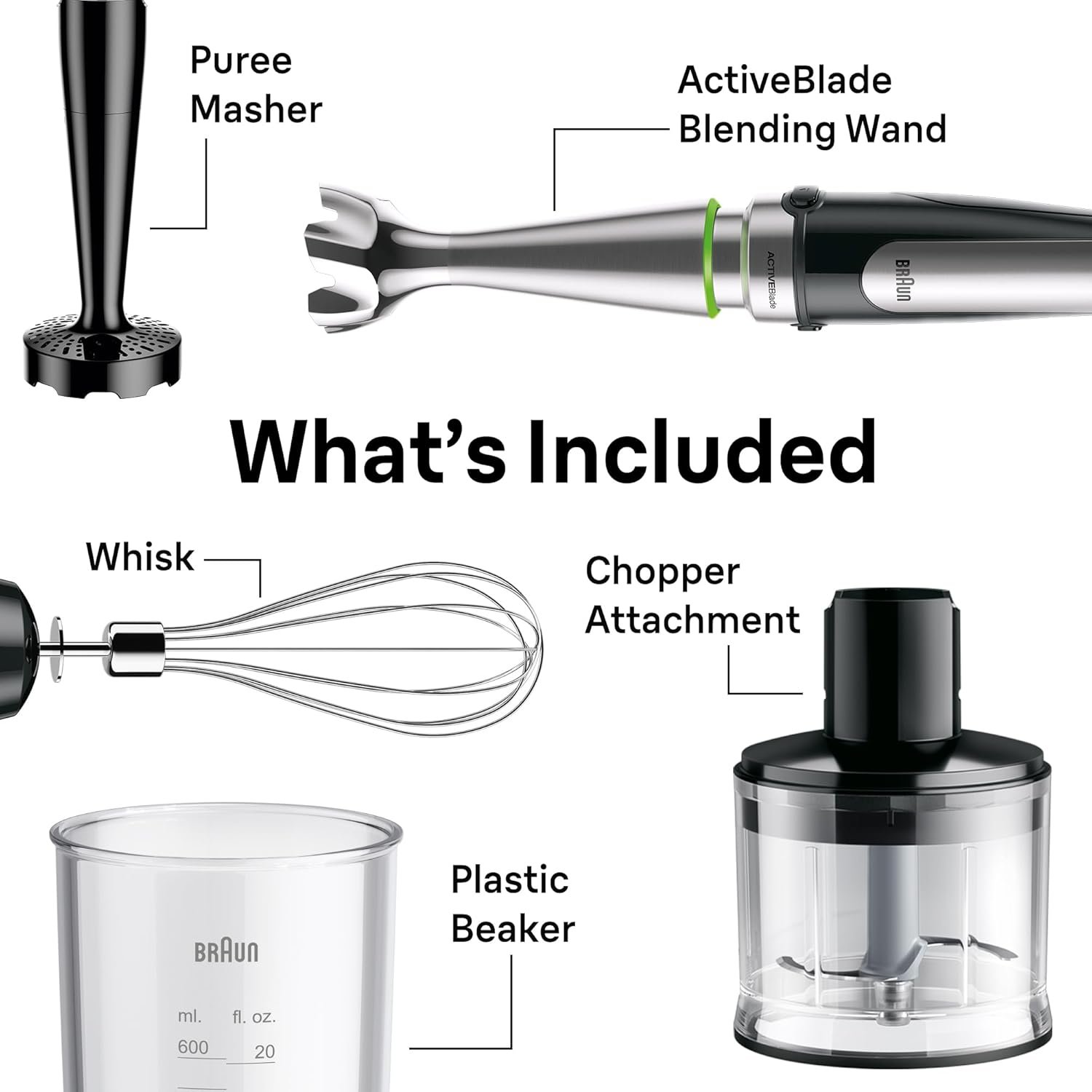 WHAT’S INCLUDED – The MultiQuick 9 comes with a 500 mL chopper, an ice crush knife, a stainless steel whisk, a puree/masher accessory, a detachable blending wand, and a 20 oz BPA-free plastic beaker with both mL & fl oz markings.