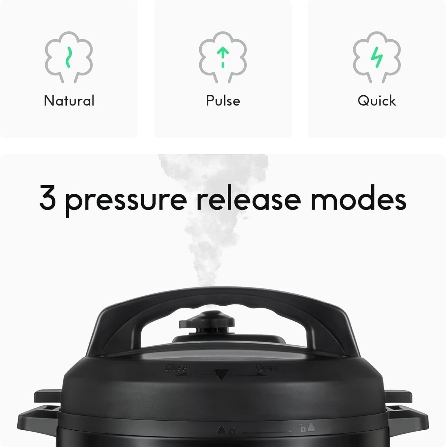 AUTO PRESSURE RELEASE: Automatically releases steam at the end of pressure cooking for increased safety and convenience. Programmed with 3 pressure release methods: quick, pulse, and natural