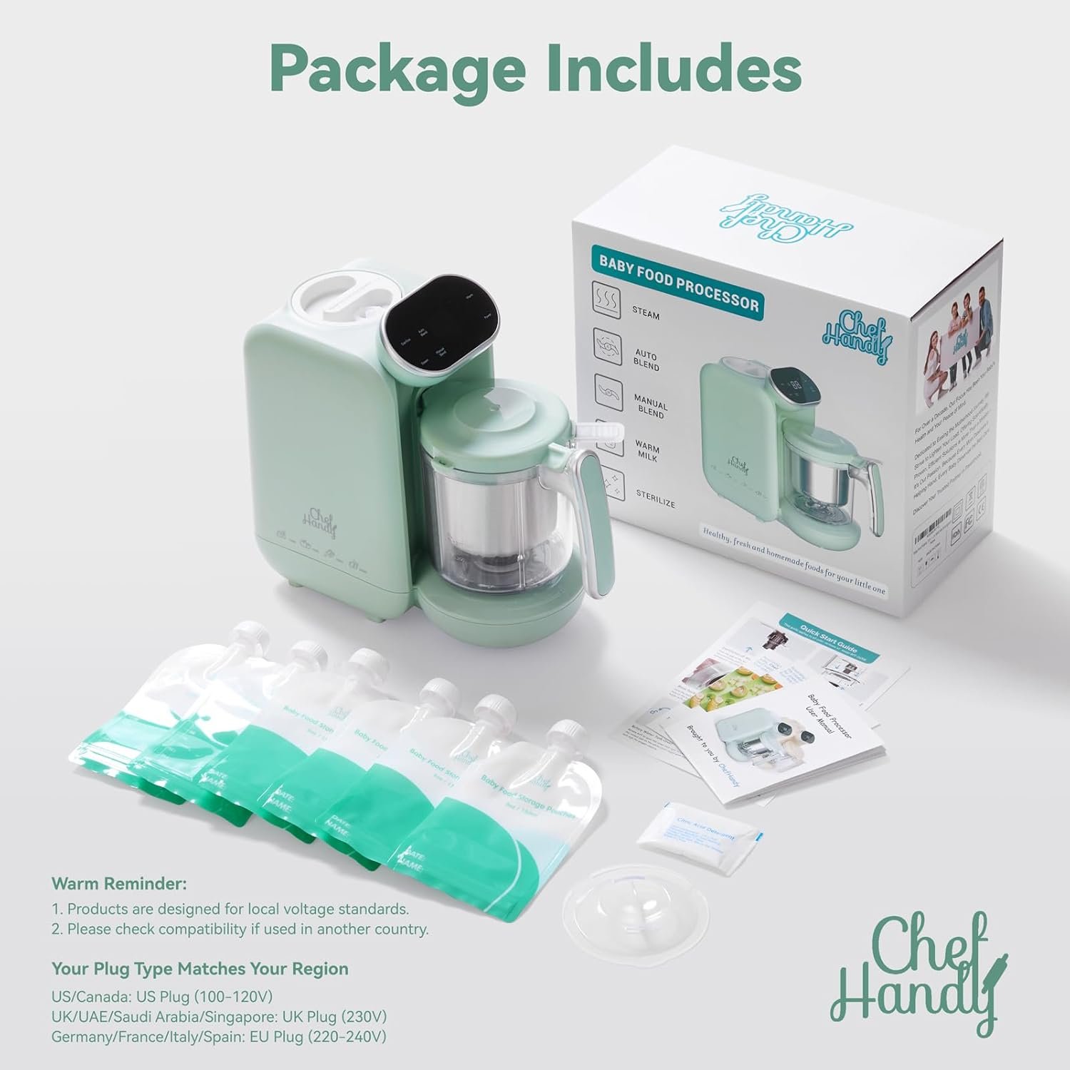 Chefhandy Baby Food Maker, 5 in 1 Baby Food Processor with Steaming Basket, Auto Cooking & Grinding, Touch Screen Control, Baby Steamer and Blender, Baby Food Puree Maker Warmer Mills Machine (Green)