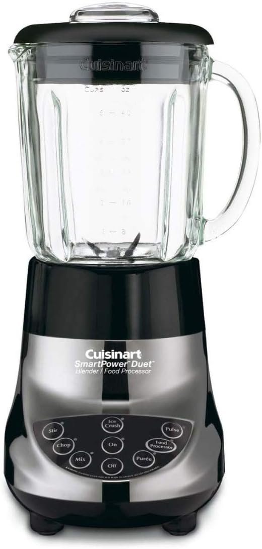 Cuisinart powerful new 7-Speed blender also has a genuine Cuisinart food Processor. A heavy-duty 500-watt motor pulses, stirs, mixes, purees, chops and even crushes ice in record time. In food Processor mode, users can slice, shred or process ingredients right into a 3-Cup work bowl. It’s big, it’s powerful and it’s easy – removable parts are dishwasher-safe! Features: Full-power 500-watt motor with overload protection|Die-cast metal housing|48-ounce glass blender jar with premium ultra-sharp stainless steel blade assembly|3 cup food processor attachment with feed tube and pusher slicing/shredding disc and stainless steel chopping blade|7-speed electronic touchpad controls with LED indicators|Removable 2-ounce measuring cap on blender jar lid|Recipe book|Limited 3-year warranty|BPA free