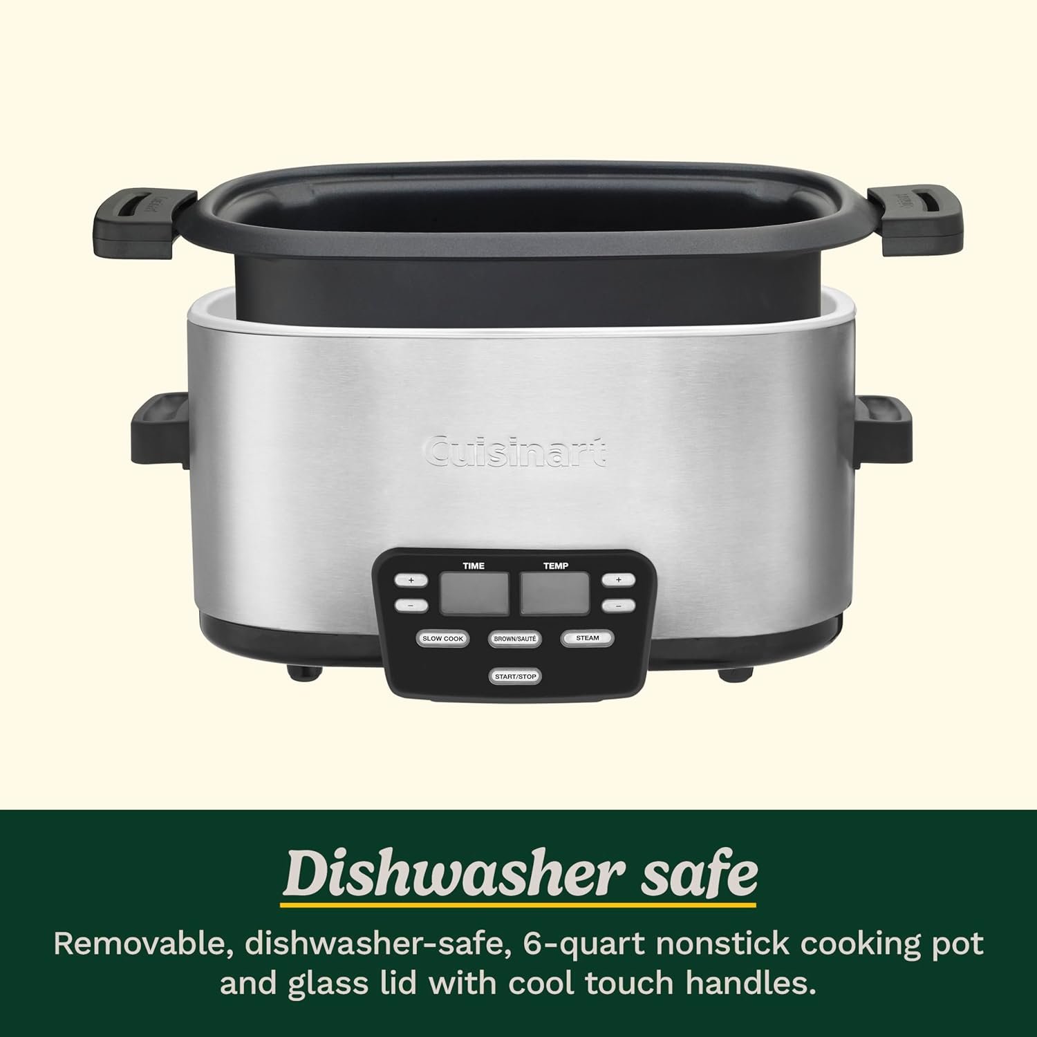 The Cook Central features Cuisinart’s brushed stainless steel housing and a 6-quart nonstick cooking pot that lets you brown or saut&#233 directly in the unit. Once your meal is ready, the unit will automatically shift to Keep Warm mode so your meal is ready when you are. Serving your dish is easy — just lift the pot out and take it to the table. Clean-up is a breeze with the Cook Central as the pot, steaming rack and glass lid are dishwasher-safe.