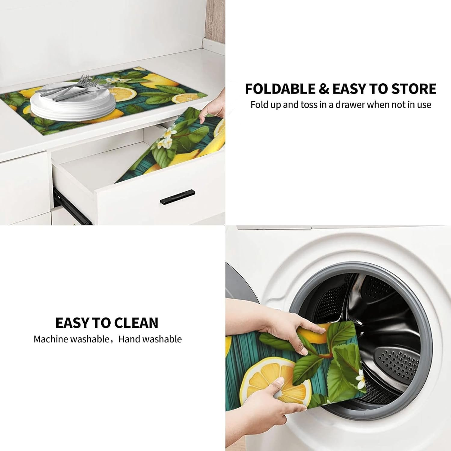 Absorbent and multifunctional: Art Lemon Kitchen dish mat is made of high-quality materials that absorb water quickly, leaving your dishes and kitchen countertops dry; the multifunctional rack mat for kitchen can be placed anywhere you want to absorb water