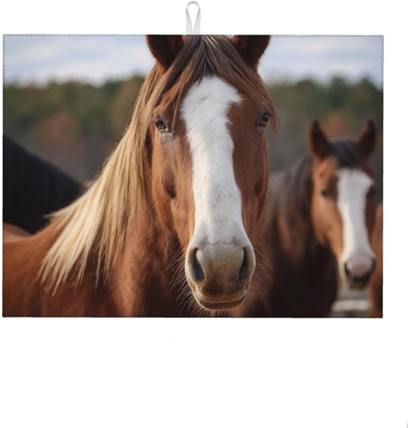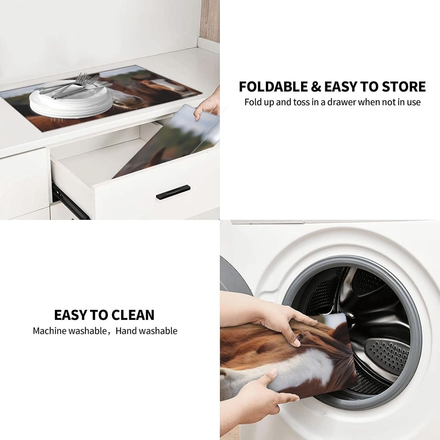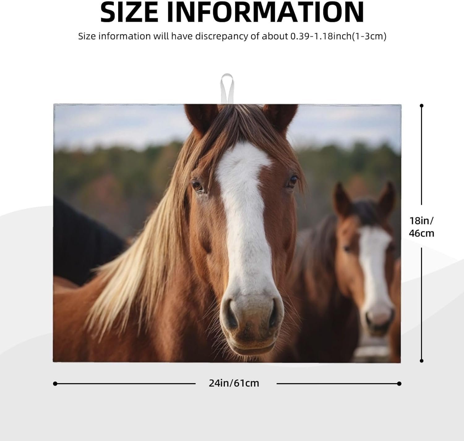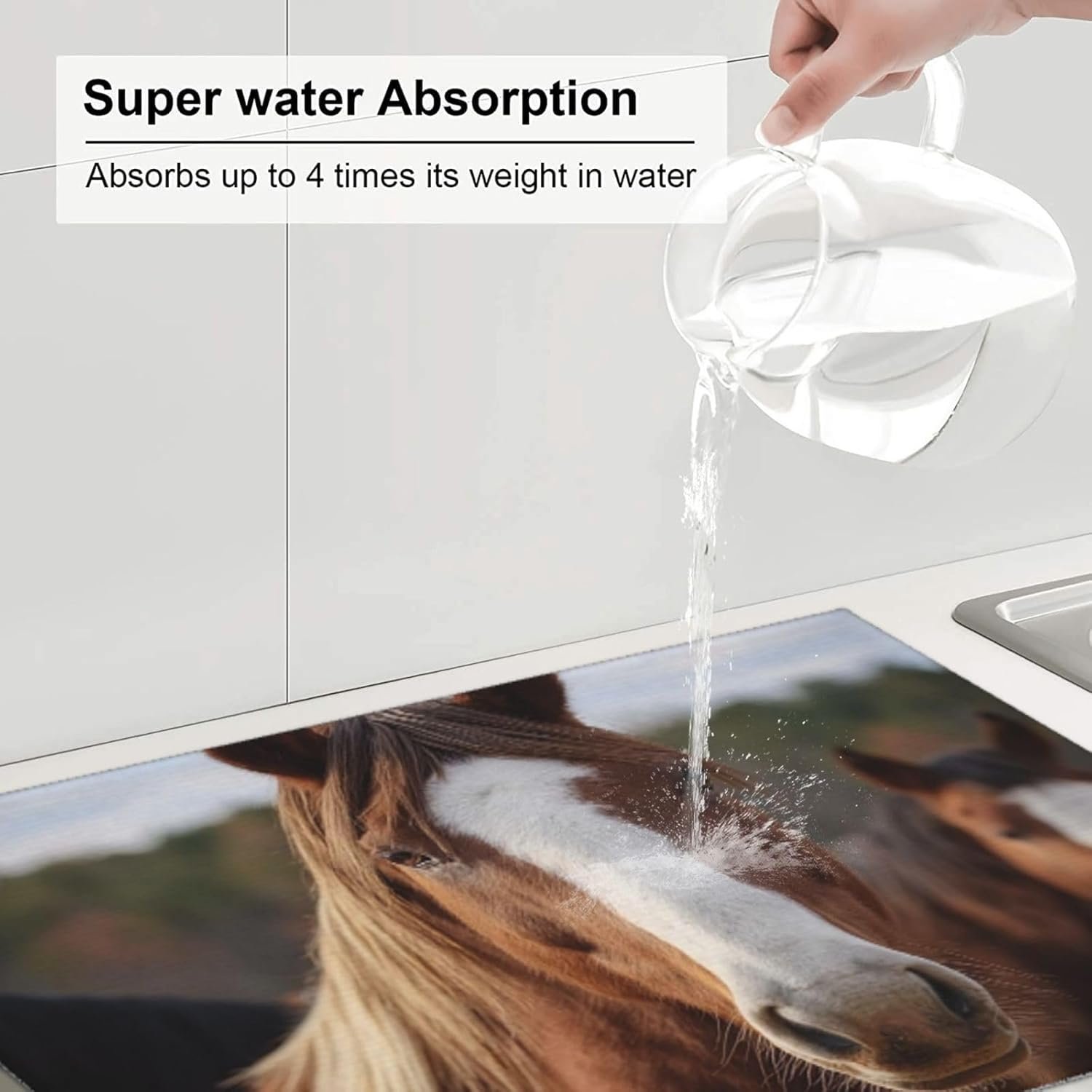 : the Horses Animals microfiber tableware drying mat is made of 3 layers of material the drying mat is soft and absorbent, the dish mat is thick enough to better protect countertops tableware and glassware.