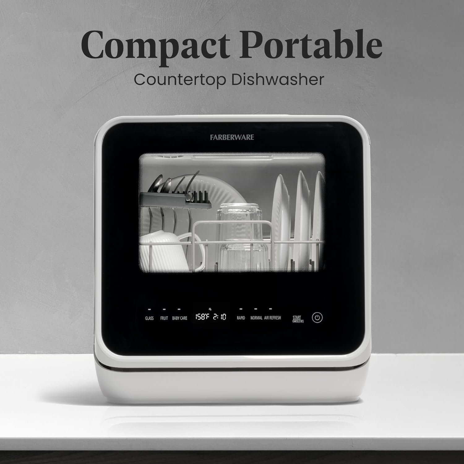 Farberware Portable Countertop Dishwasher with 5-Liter Built-in Water Tank – 5-Program System for Home, RV, and Apartment – Wash Dishes, Glass, and Baby Products
