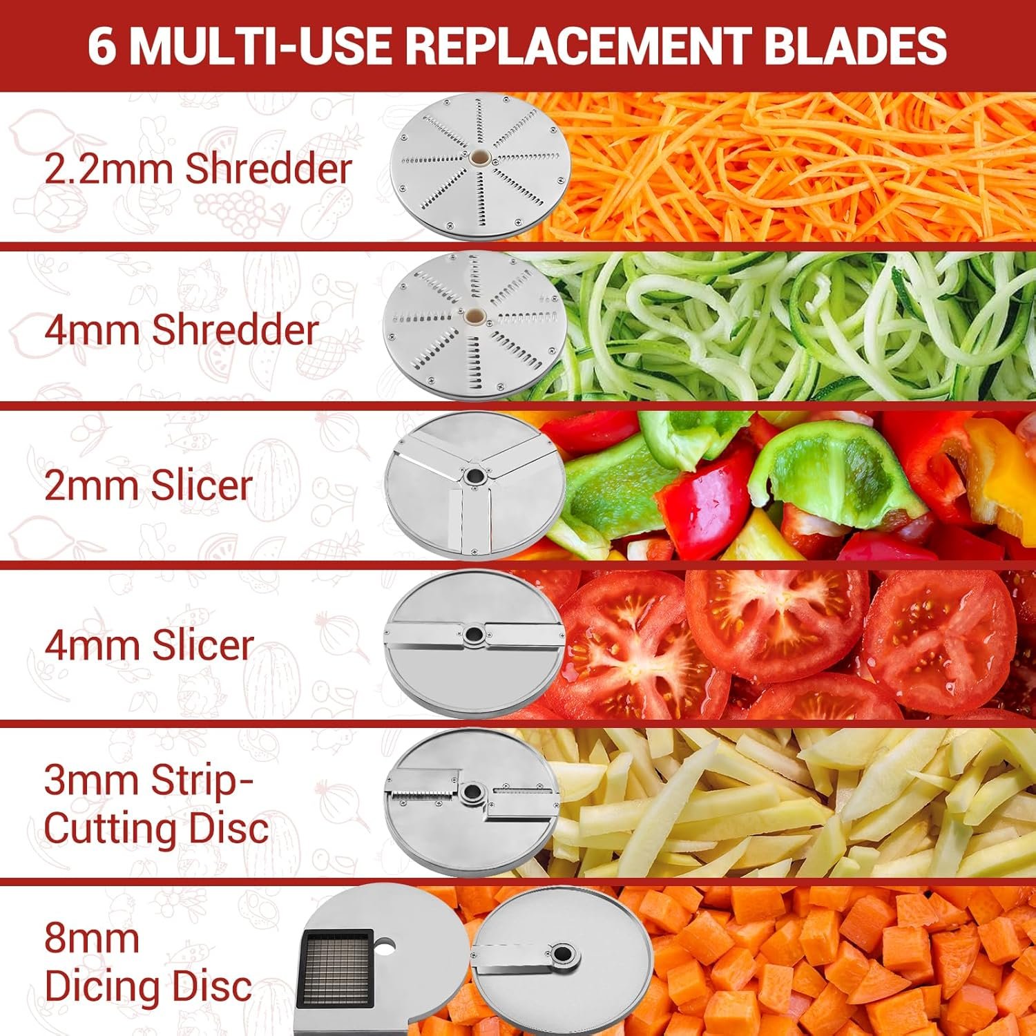 Versatile Cutting Options: Equipped with six detachable cutting disks, including 2mm/4mm Slicer, 2.2mm/4mm Shredder, 3mm Strip-Cutting Disc, 8mm Dicing Disc, this multifunctional food chopper allows you to effortlessly prepare fruits and vegetables with precision