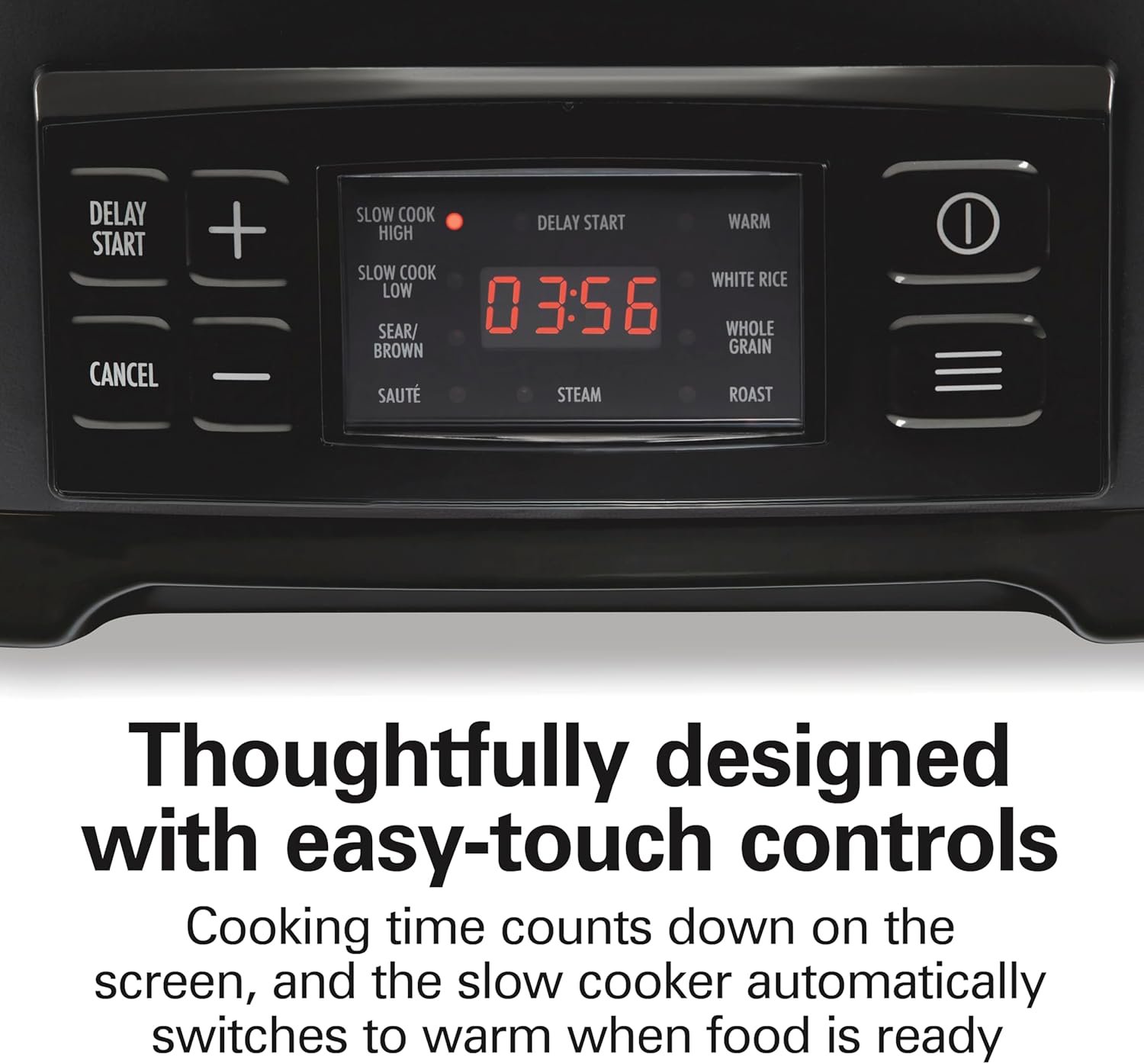 The time counts down on the screen, so you can track the remaining cook time and know when food is ready. When food is ready, the slow cooker automatically switches to warm. Simply wipe the control panel to keep clean.