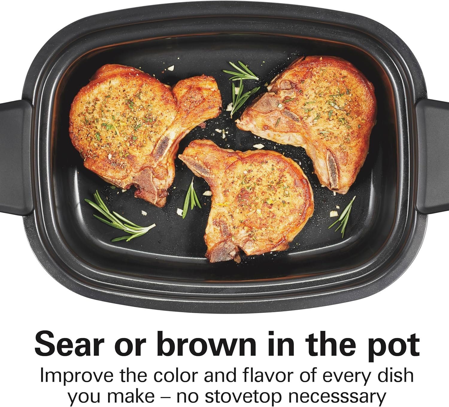 SEAR OR BROWN RIGHT IN THE POT: Sear or brown right in the ceramic nonstick pot — no stovetop necessary. Improve the color and flavor of every dish you make in this searing slow cooker by searing or browning before you roast or slow cook foods.
