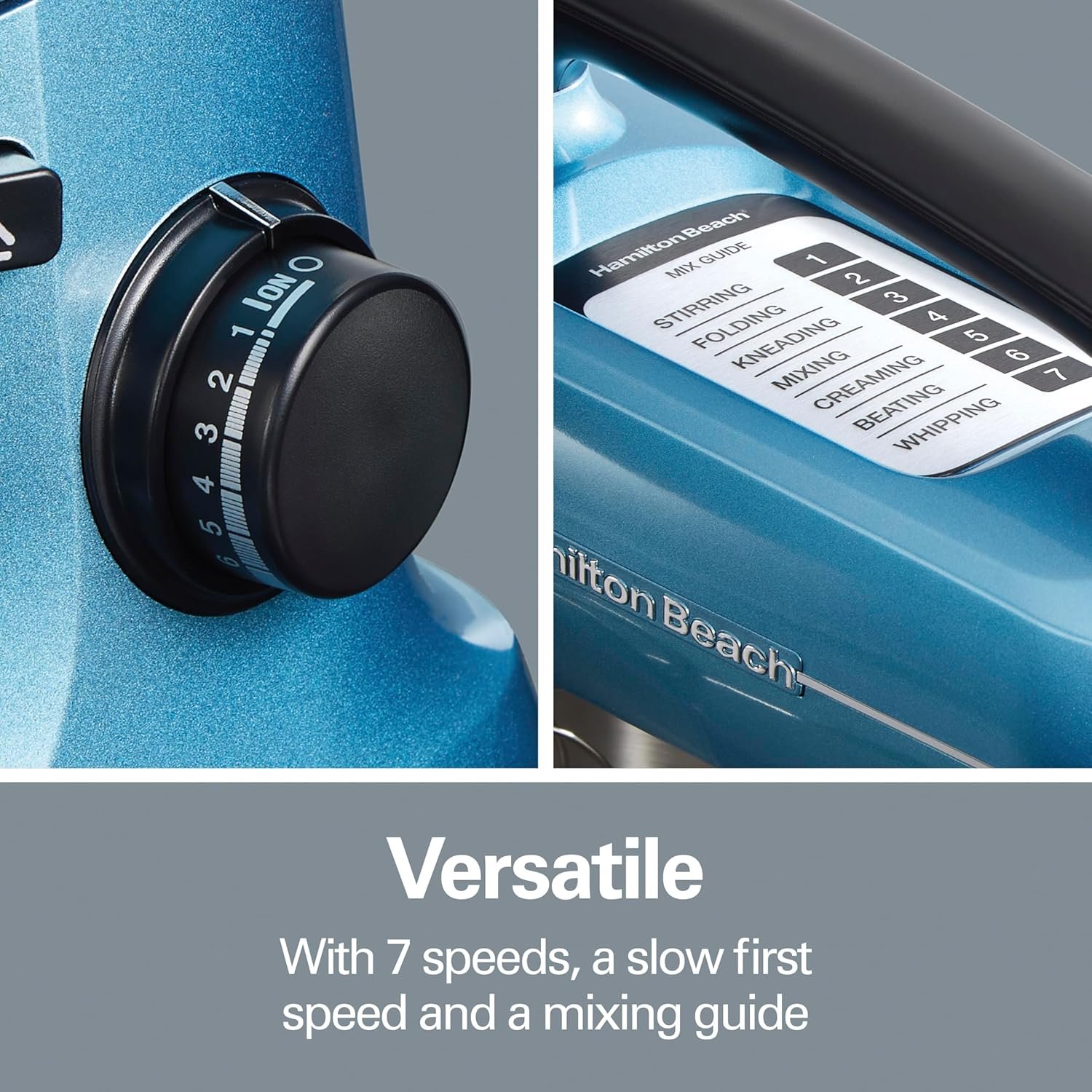 VERSATILE — 7 SPEEDS, SLOW FIRST SPEED & MIXING GUIDE: A helpful guide on top of the electric mixer helps you choose the right speed for the job. The slow first speed is great for kneading bread and reducing splatter when adding dry ingredients to wet ingredients.