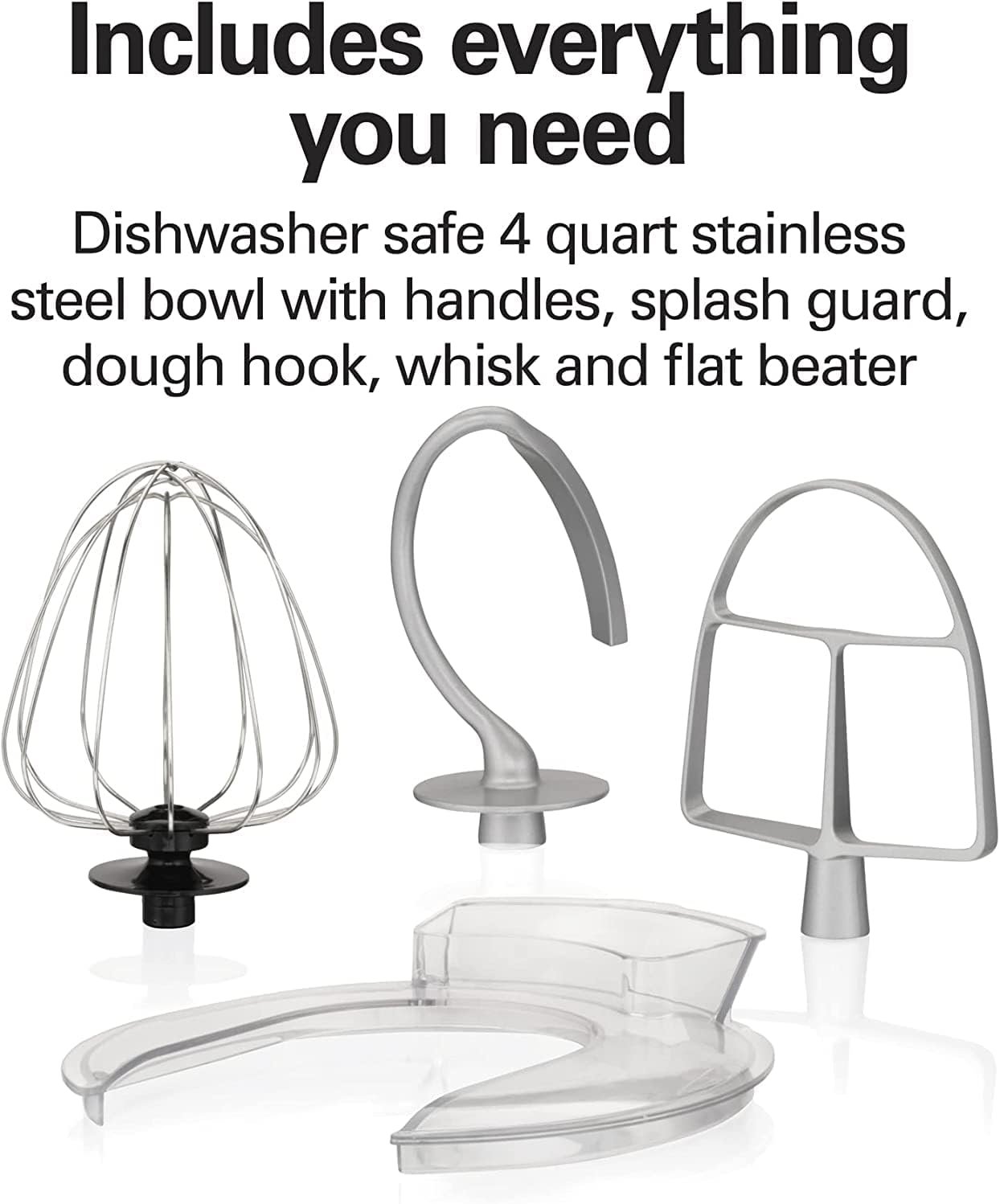 INCLUDES EVERYTHING YOU NEED: In addition to the stainless steel bowl with handles, the stand mixer comes with a splash guard, dough hook, whisk and flat beater. The bowl and the stand mixer attachments are all dishwasher safe.