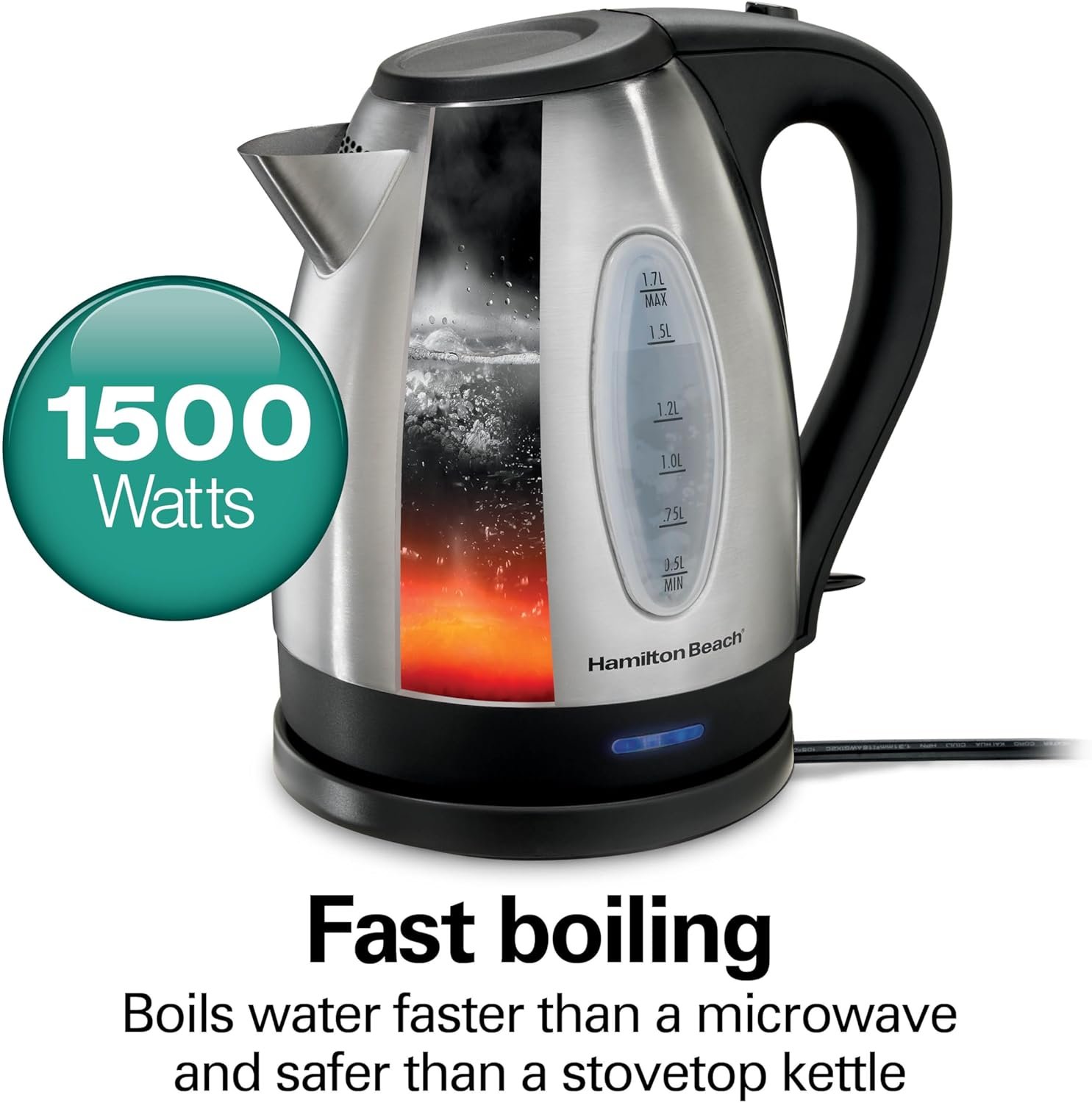 Hamilton Beach Electric Tea Kettle, Water Boiler & Heater, 1.7 Liter, Cordless Serving, 1500 Watts for Fast Boiling, Auto-Shutoff and Boil-Dry Protection, Stainless Steel (40880)