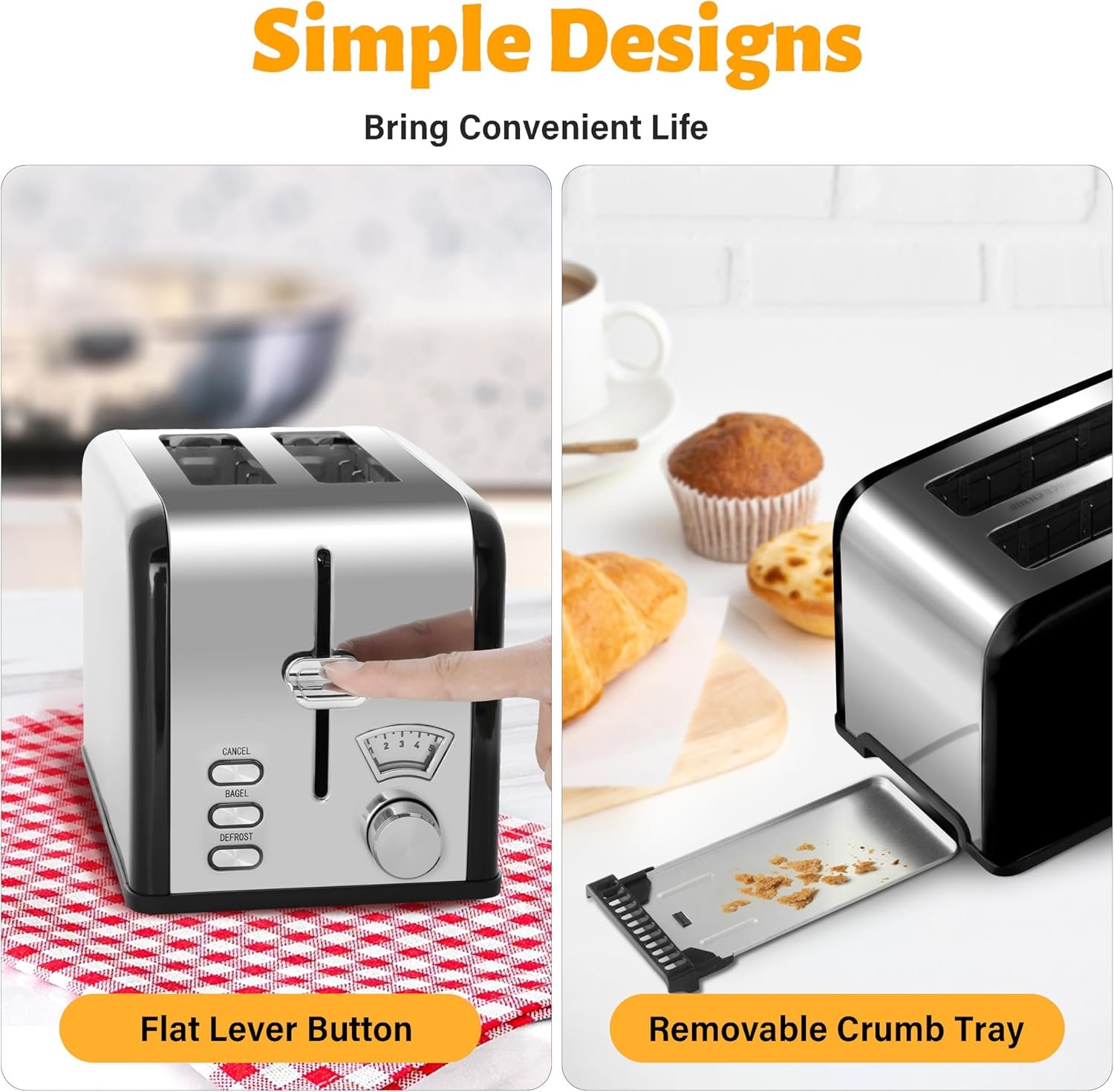 Easy to clean & store: The removable crumb tray helps collect and dump falling crumbs. The sleek stainless steel finish makes wiping down the bread toaster a piece of cake. And the Built-in cord storage will keep clutter to a minimum