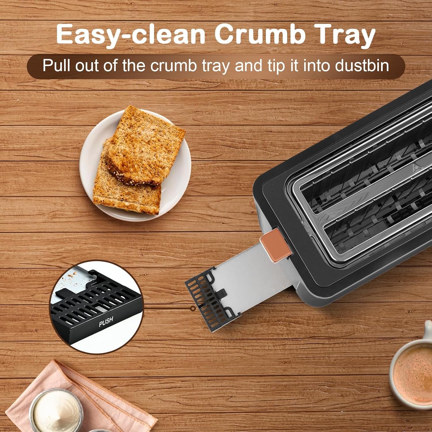 【Easy To Clean】: Made of non-stick food grade stainless steel in toasting slots, and a removal crumb tray on the bottom, you can always clean the bread toaster with less effort. Stainless steel and heat resistant material lead to a cool touch body and easy cleaning appliance in your kitchen (The slots is hot during toasting, do not touch directly)