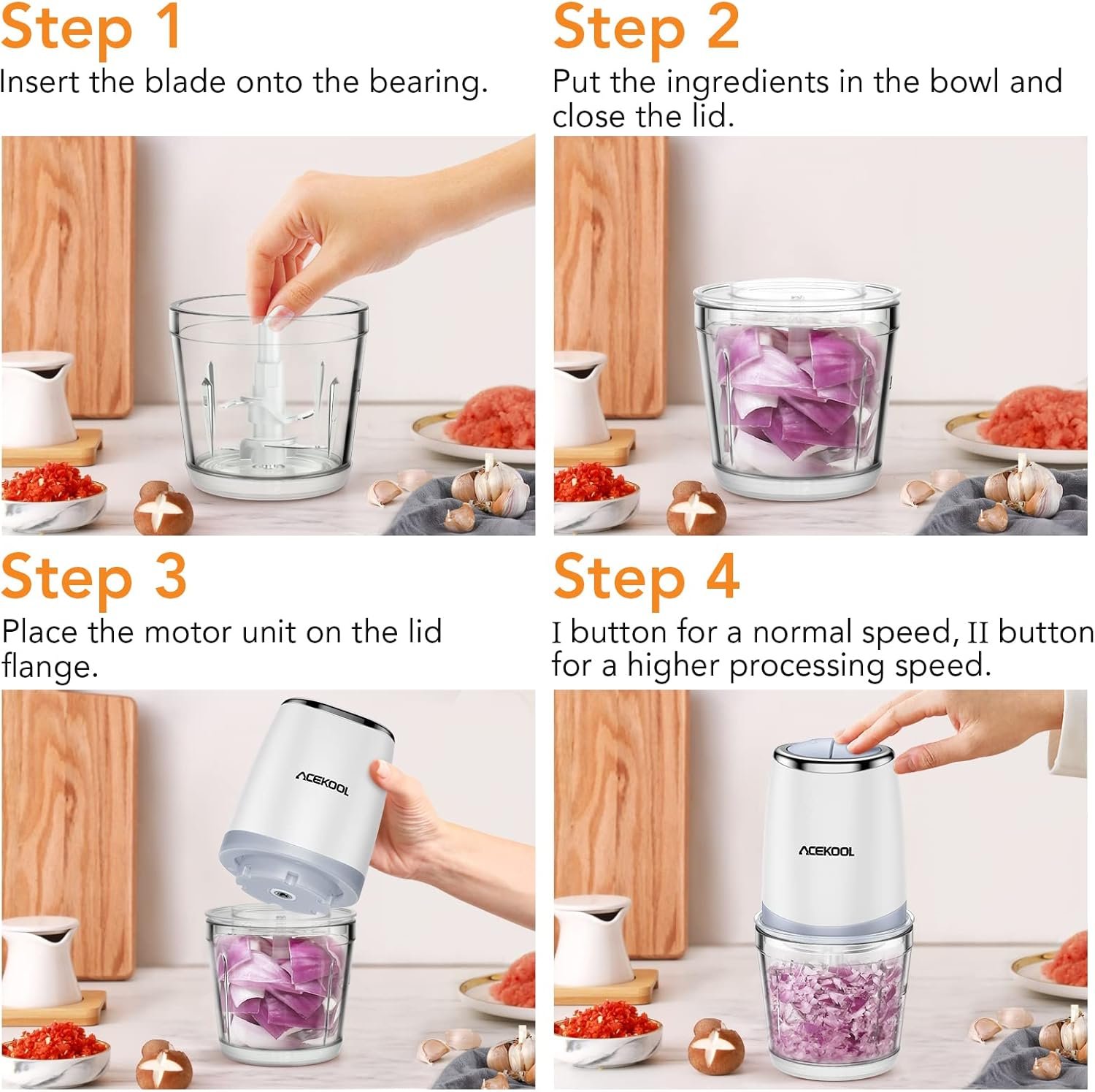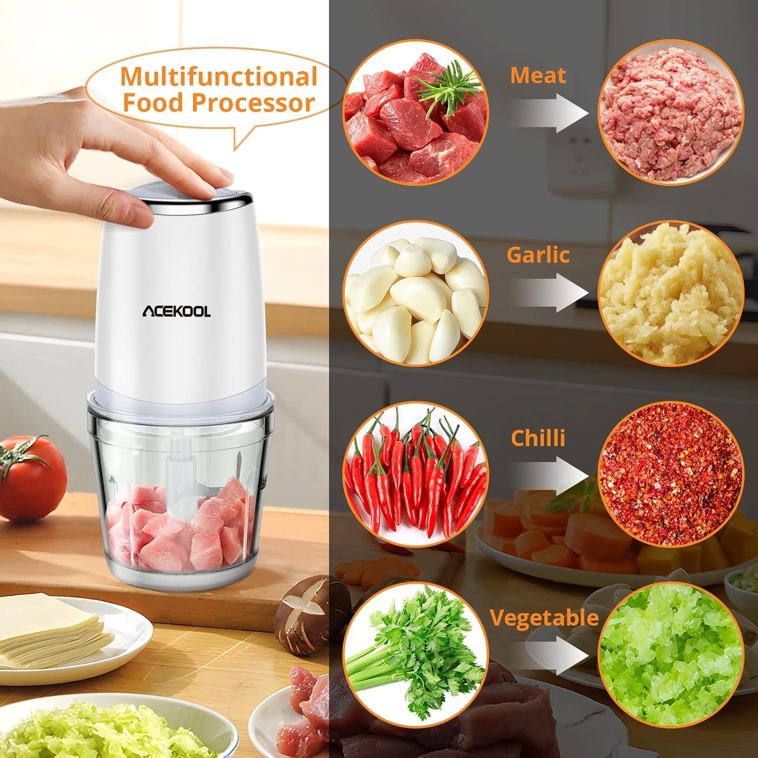 Food Chopper Express Chop: With the Acekool small food processors make quick work of everyday chopping, grinding, pureeing, and whisking! Chop fruits, vegetables, meat, bread, nuts, garlic, onion, mix up relishes and blend up dips and sauces. Make homemade nut butter, or grind spices and grains