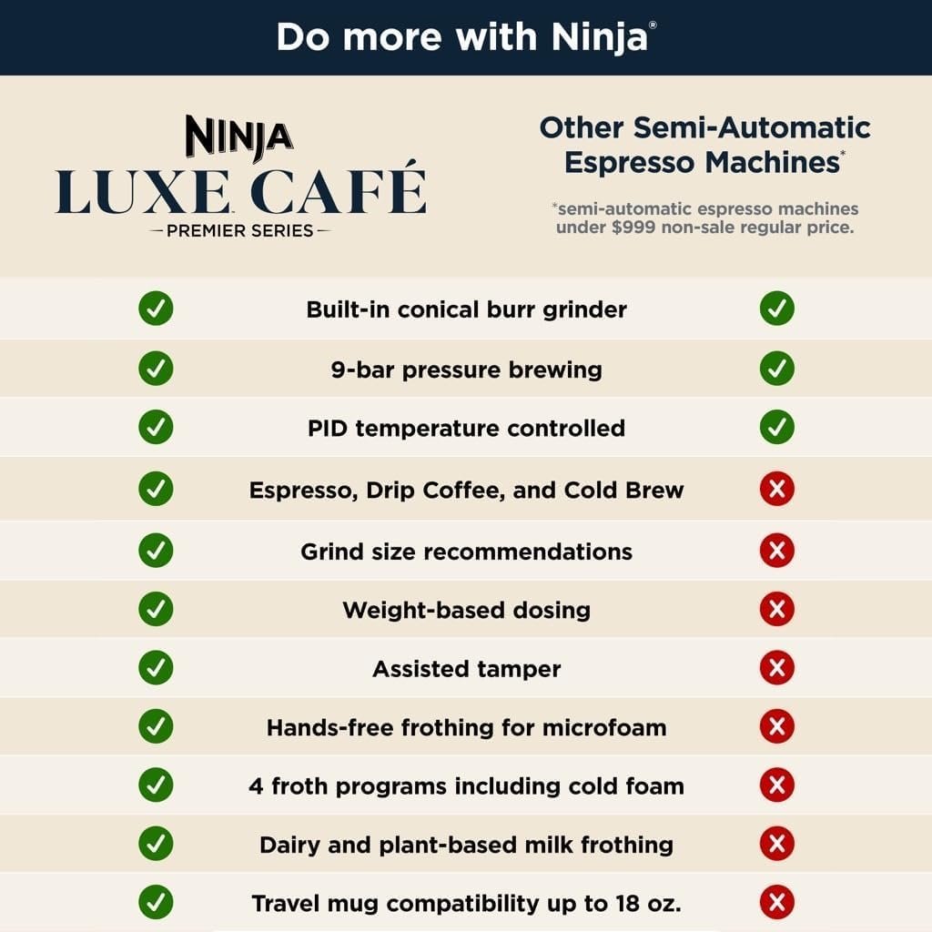 The ultimate guided experience that makes espresso uncomplicated. The Ninja Luxe Café Premier Series is an intelligent espresso & coffee system with unmatched 3-in-1 versatility (no guesswork espresso, well balanced drip coffee and rapid cold brew), that helps you elevate your coffee routine and create café-quality drinks at home. Barista Assist Technology guides you to the perfect cup from grind size recommendations to automated brew adjustments, while the Dual Froth System effortlessly creates perfectly textured microfoam hands-free.