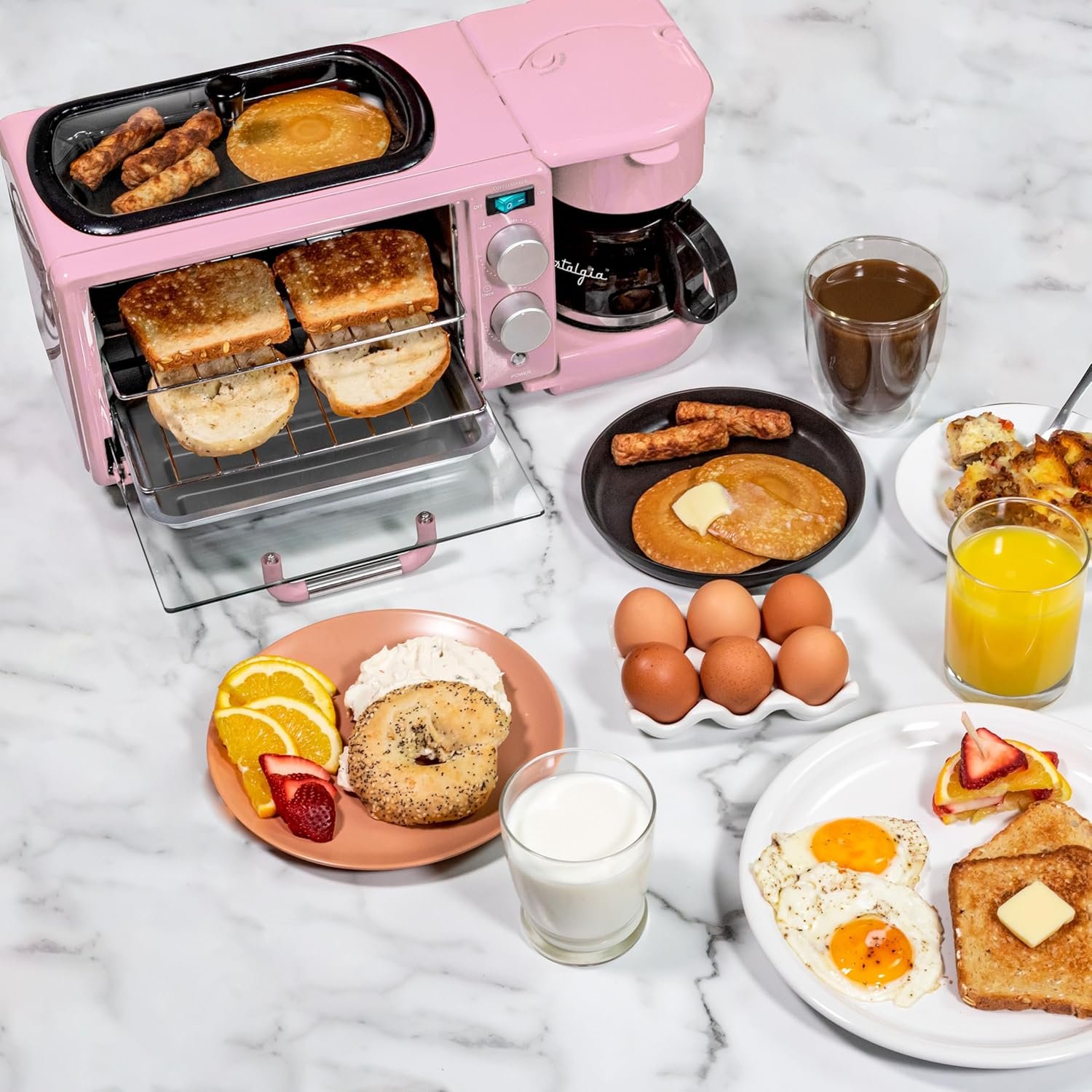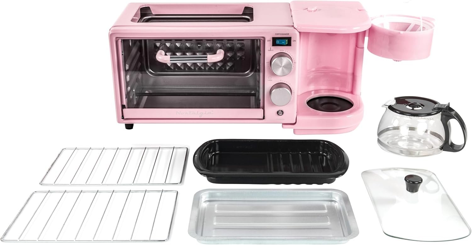 Nostalgia 3-in-1 Retro Breakfast Station – Includes 5 Cup Coffee Maker, Non-Stick Ceramic Griddle, and 4-Slice Toaster Oven – Built-In Timer, Reusable Coffee Filter, Space-Saving Design – Pink