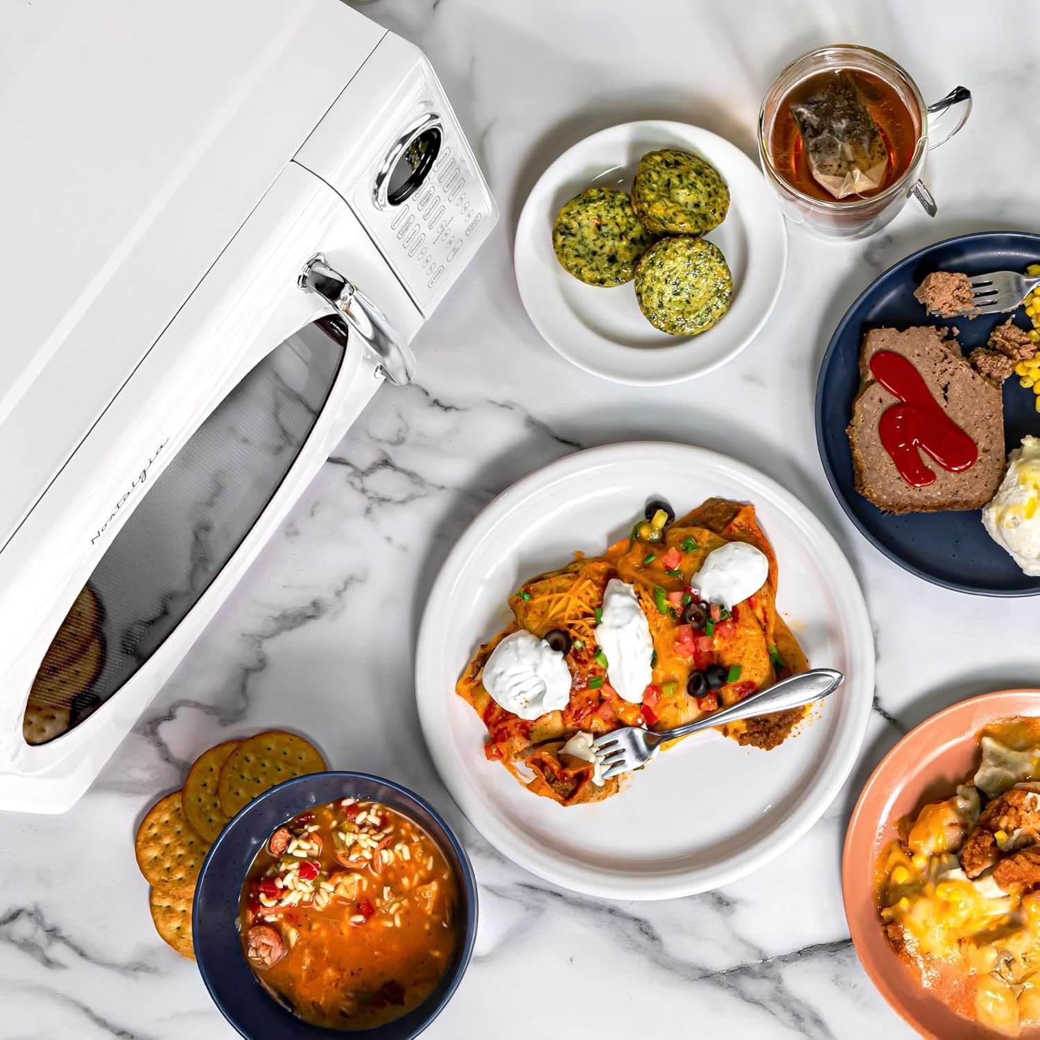 Nostalgia Retro Microwave Oven 0.7 Cu Ft, 700-Watt Countertop Size with Glass Turntable, Child Safety Lock, 8 Auto-Cook Programs, Digital Clock, White