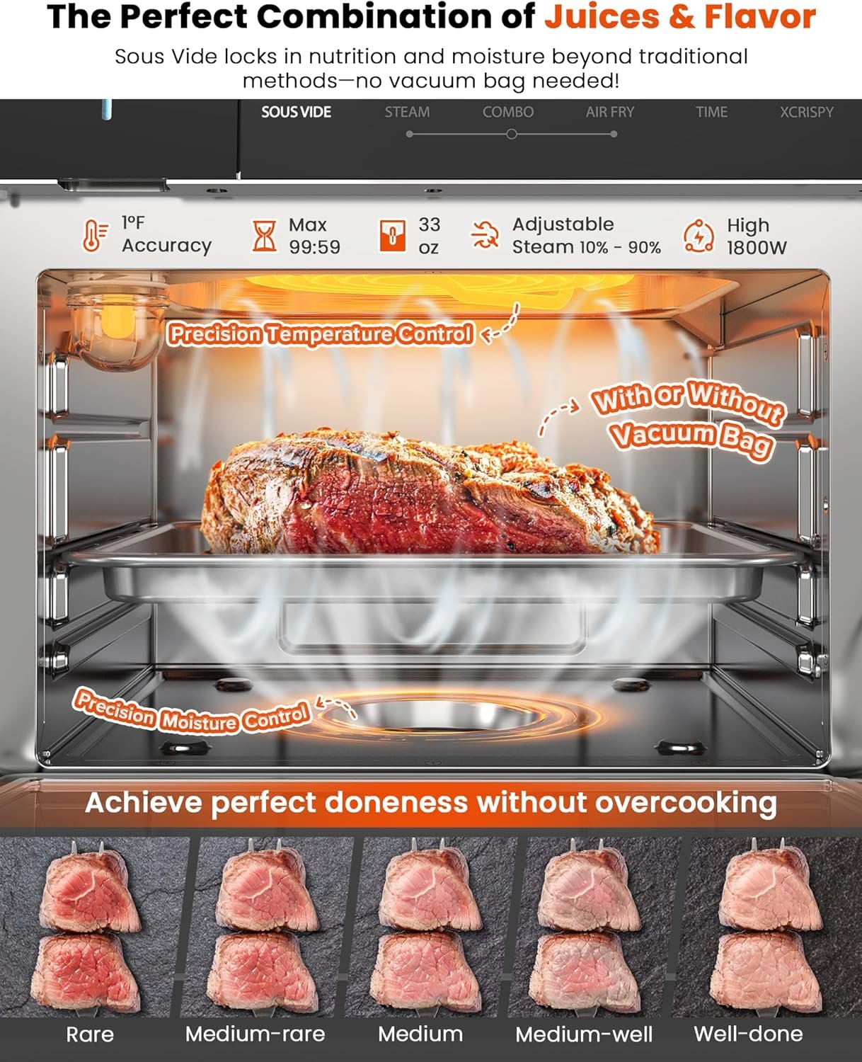 AIR SOUS VIDE OVEN – No bags, sous vide machines, or water baths needed for eco-friendly cooking. Control temperature with 1°F precision increments and moisture from 10-90% for tender, juicy food with perfectly even texture.