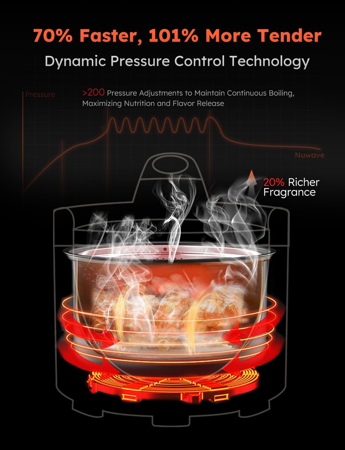 6 MINS TO A PERFECT DISH: NuWave electric pressure cooker employs Dynamic Pressure Control Technology, maxmaking 200 pressure adjustments to maintain continuous boiling, thus maximizing nutrition and 20% tastier flavor release. With 80kPa max pressure, cooking speed is 70% faster than others.