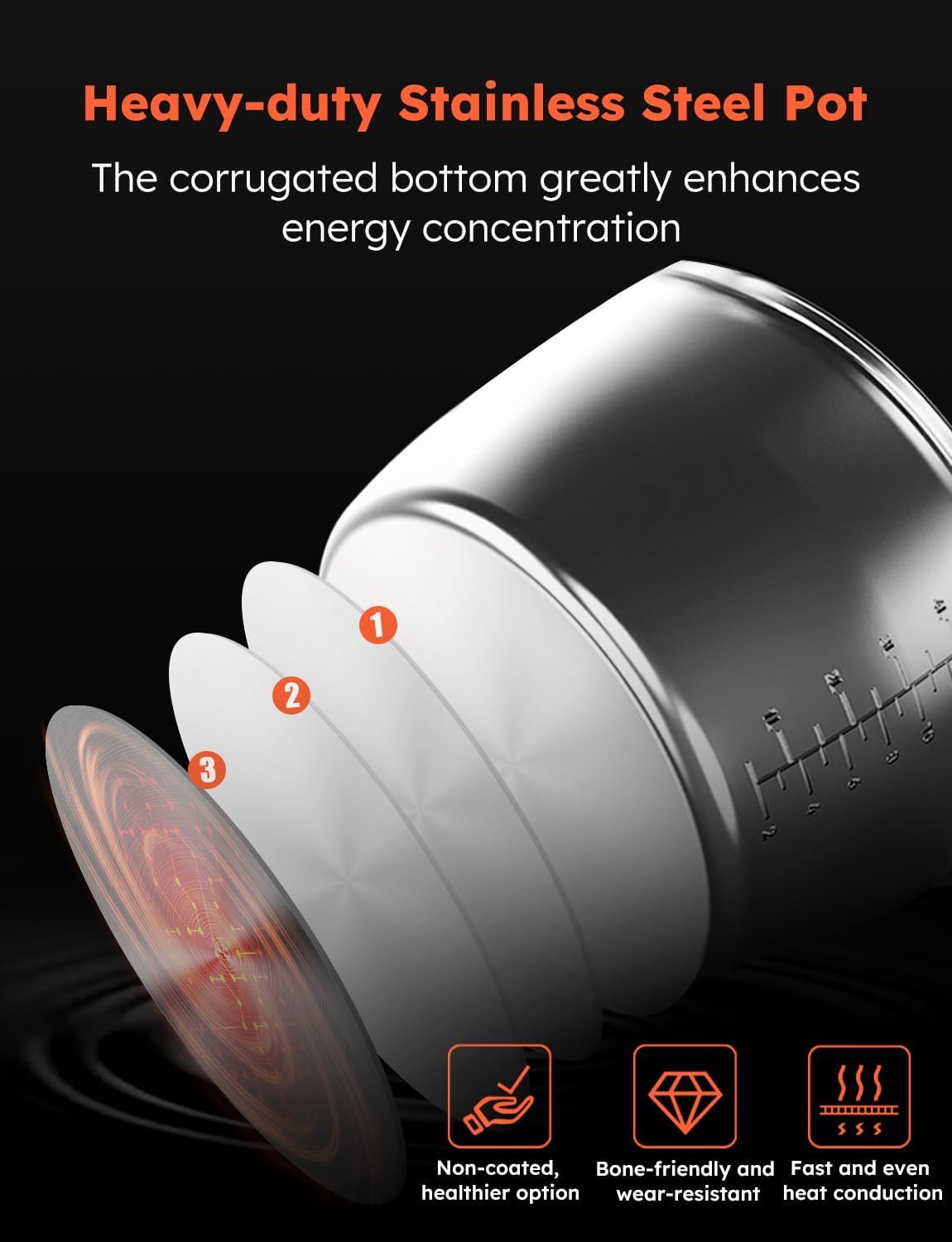 3-THICKER INNER POT: The pressure cooker inner pot crafted from heavy-duty 18/10 stainless steel, triple-thick, non-coated, easily withstand 6 lbs of friction for 6,000 cycles. Bone-Friendly and Wear-Resistant.