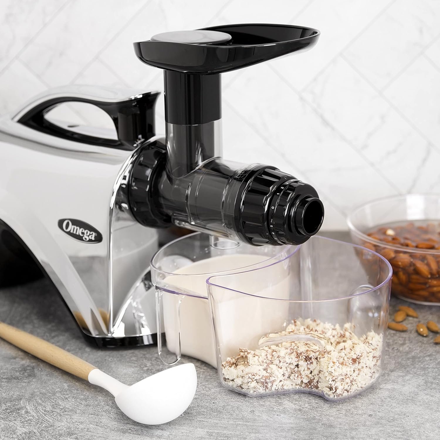 The Omega NC900HD Nutrition System is a masticating juicer machine. Sometimes referred to as a low-speed juicer, the Nutrition Center processes at 80 RPM, whereas most other juice extractor machines process at a speed of 1,650 to 15,000 RPM. The low speed protects and maintains healthy enzymes, prevents oxidation, and allows juice to be stored for longer periods without degradation. One of the most effective ways to easily access nutritious enzymes that help to improve immunity and overall health, Omega Juicer Machines are designed to deliver a potent dose of antioxidants to boost and support overall health and immunity. Don’t eat your fruits and veggies—juice them and enjoy a day’s worth of vitamins in 1 delicious drink! The dual-stage juice processing system extracts the maximum amount of juice from fruits, vegetables, leafy greens, and even wheatgrass! You can also use your Omega low-speed juicer to turn nuts into nut butters, make baby food from natural, fresh ingredients, whip up soy milk, extrude pasta, grind coffee and spices, and mince herbs and garlic. Make delicious and nutritious drinks and snacks that everyone will love with the help of this slow juicer cold press machine. Note: some noise is to be expected. Please set this compact juicer machine juicer on top of a thin towel to help stabilize and mitigate noise.
