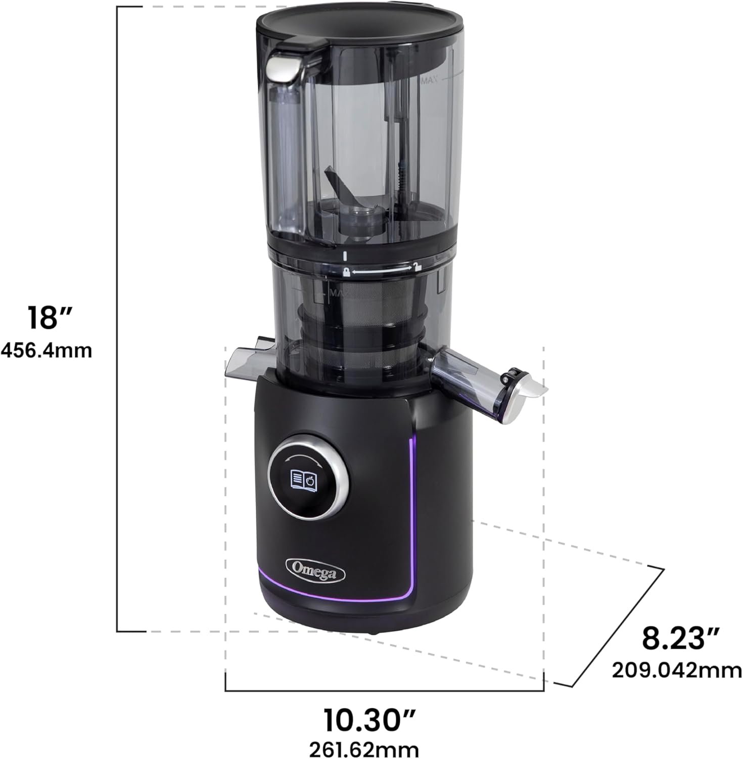 Introducing the new Omega Performance Batch Juicer with Intellidial Technology. The first smart juicer designed to redefine your juicing experience for a more vibrant, heathier you. Access 30 built-in recipes directly within our patented IntelliDial organized by health benefits like anti-inflammatory, antioxidant or hydration. For even more variety, scan the QR Code embedded in the dial to explore endless options for delicious, nutrient rich juices and conveniently generate a shopping list right at your fingertips. Enhance your overall health with this cold press juicer with 3-stage auger that utilizes a slow squeezing method to extract the maximum amount nutrients and flavor from fruits and vegetables. Load up the 64 oz. (6″) batch hopper with an entire recipe or just juice whole fruits and vegetables to reduce prep time. Customize your juice for more flavor. With 3 built in languages, English, French and Spanish this juicer caters to a wide range of users. Designed to elevate your kitchen in both functionality and style, the premium matte finish complements any décor, while the customizable mood light ring adds a touch of style with a variety of color options to match your kitchen and mood. Enjoy daily nutrition in one, simple, smart, beautiful pour. Omega, lift a glass to health and happiness.