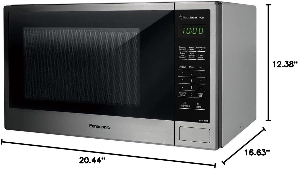 The Panasonic NN-SU696S Stainless steel 1.3 Cubic feet countertop microwave oven provides 1100 watts of high cooking power and fits compactly on any kitchen counter. With a touch of the genius sensor cooking button, This microwave oven eliminates the guesswork by automatically setting power levels and adjusting cooking or reheating time. The genius sensor measures the amount of steam produced during cooking and signals the microprocessor to calculate the remaining cooking time at the appropriate power level. 7 pre-programmed settings allow for convenient cooking of your favorite fresh or frozen foods (sensor cooking Chart included in manual). microwave popcorn with the push of a button – choose from 3 power level options for perfect popping every time. Keeps foods like vegetables, soups, hors d’oeuvres, gravies, sauces and desserts warm and delicious in the microwave oven until they’re ready to serve. Other highlights include 10 power levels, keep warm mode, delay start, timer, quick 30 seconds 13.4 inch turntable and more/less control. This compact Stainless steel countertop microwave oven externally measures 12 3/8 inch (h) x 20 7/16 inch (W) x 16 inch (D)- with an interior big enough for a 12-inch casserole dish and a stylish exterior to complement any kitchen décor. Internal dimensions measure 9 13/16 inch (h) x 13 13/16 inch (W) x 15 3/16 inch (D). Disclaimer: This microwave oven complies with 2016 DoE energy conservation standards. It is important to keep the microwave oven clean and dry. Food residue and condensation may cause rusting or arcing and damage to the microwave oven. After use, wipe dry all surfaces, including vent openings, oven seams, and under glass tray.