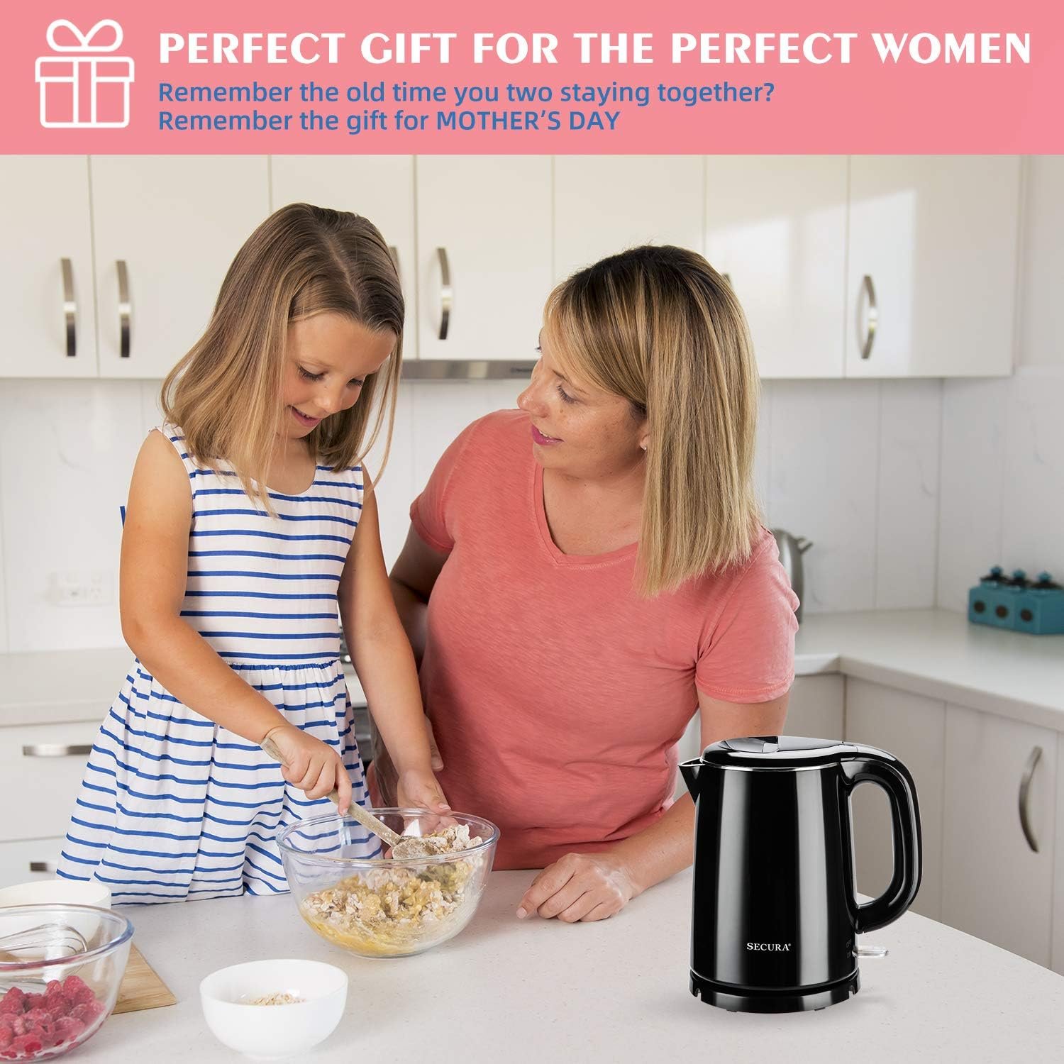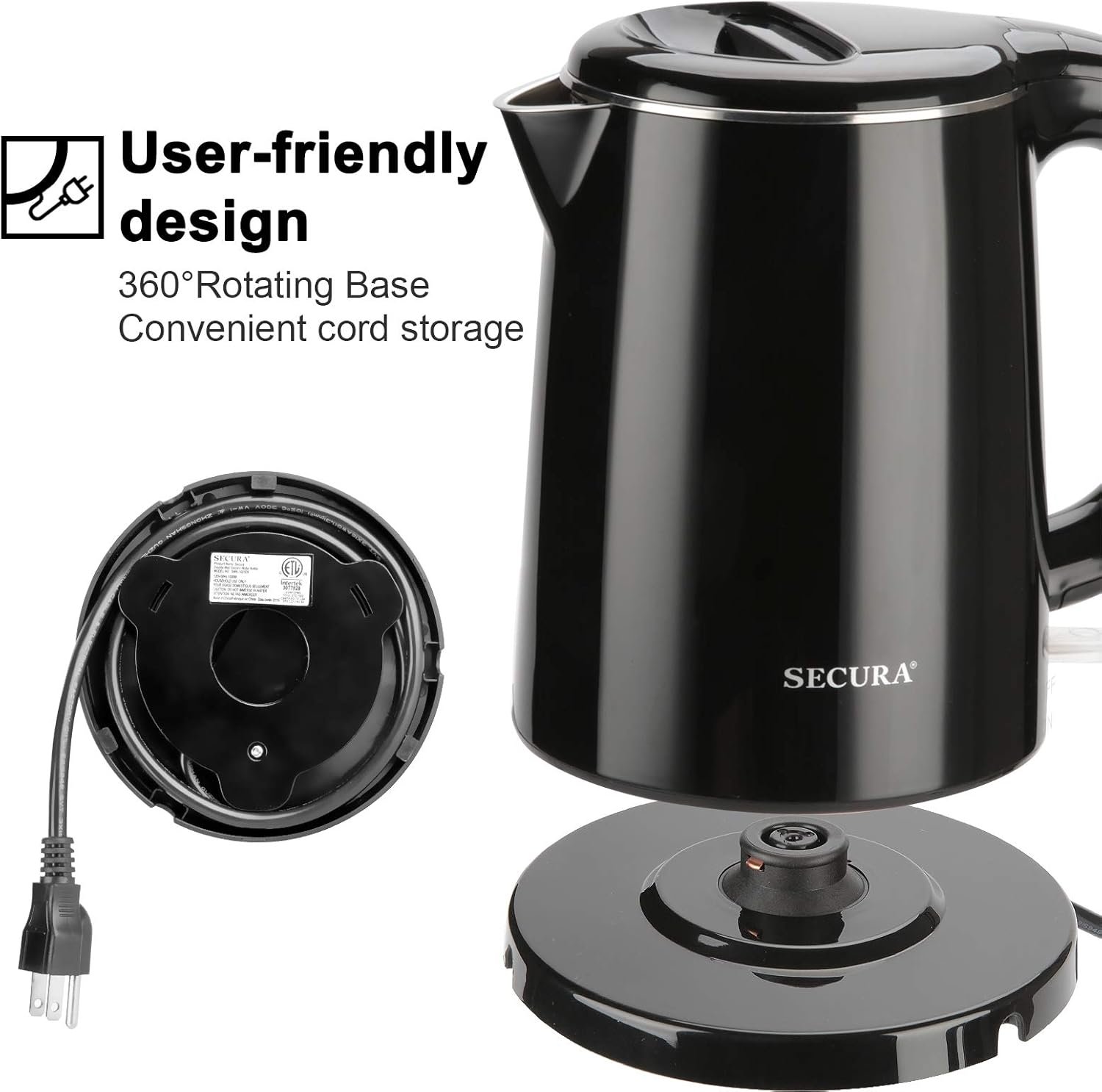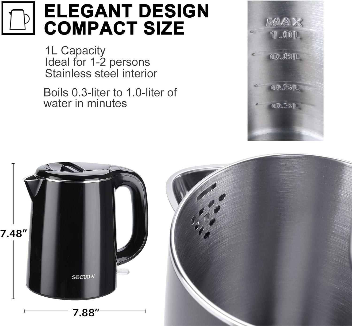 Secura Stainless Steel Double Wall Electric Kettle Water Heater for Tea Coffee w/Auto Shut-Off and Boil-Dry Protection, 1.0L (Black) SWK-1001DB/HB-K012