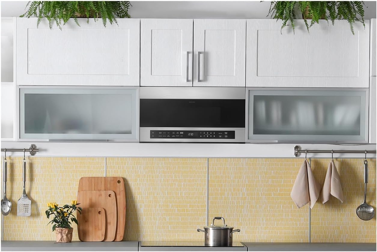 The Sharp® SMO1759JS Over-the-Range Microwave Oven is a contemporary and stylish addition to your dream kitchen. With edge-to-edge stainless steel, and black glass, this oven pairs beautifully with other stainless steel appliances. The easy-to-read, white display, gray interior and bright LED interior and cooktop lighting are elegant finishing touches for your modern kitchen.