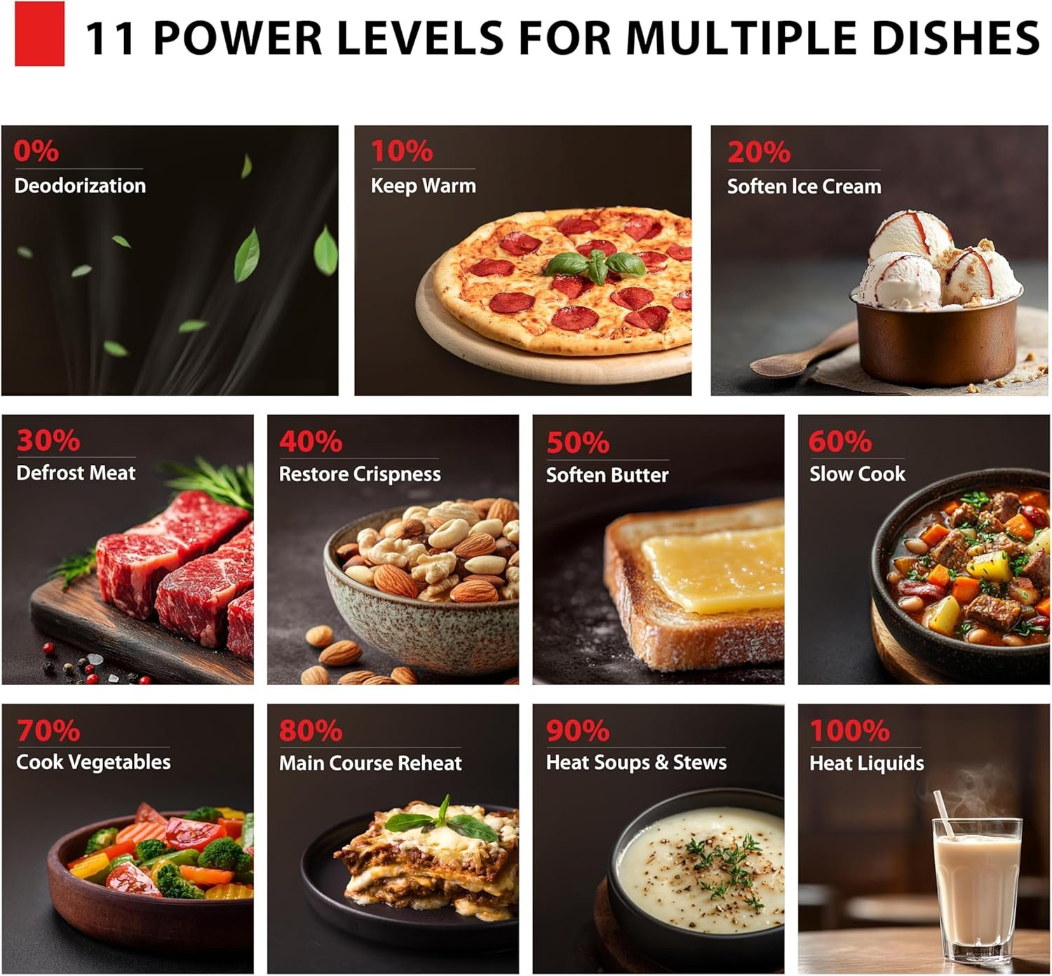 11 Unique Power Levels with clock and kitchen timer: Tailor your cooking power levels for greater culinary flexibility, making it an essential kitchen tool. Perfect for everything from deodorization to boiling liquids.