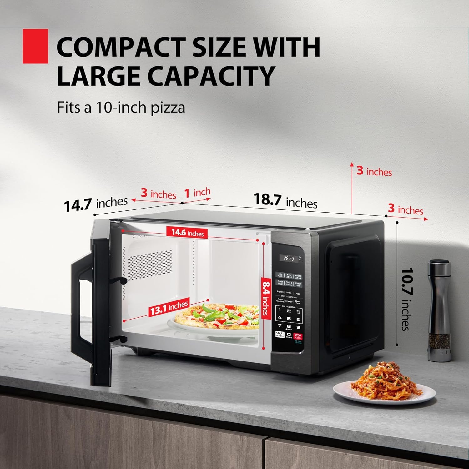 Microwave output power 900 watts, input power 1400 watts. External dimensions 18.7x 14.7x 10.7 inches (WxDxH); internal dimensions 14.6×13.1x 8.4 inches (WxDxH); includes 10.6-inch glass turntable.