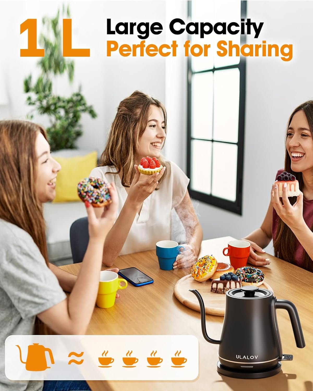 Ulalov Electric Kettle 1L Gooseneck Water Kettle Quick Heating for Pour Over Coffee & Tea, Stainless Steel Hot Water Boiler with Auto Shut-Off, Boil Dry Protection, Matte Black,1200W