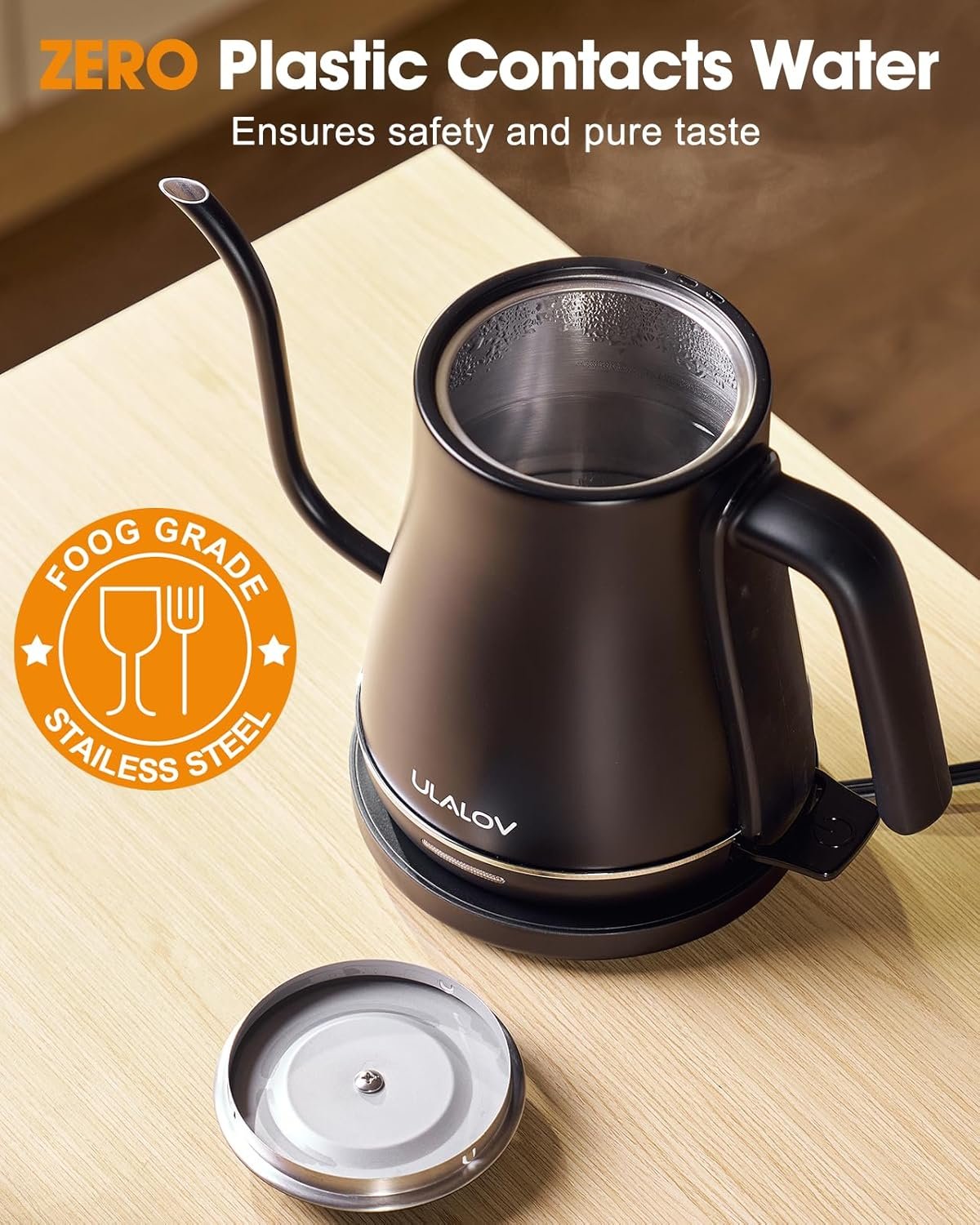 The Purest Taste: This water kettle’s durable interior, lid, and spout are made with food-grade 304 stainless steel; There’s ZERO plastic contacts with hot water aiming to ensure a pure taste and enhance the flavor