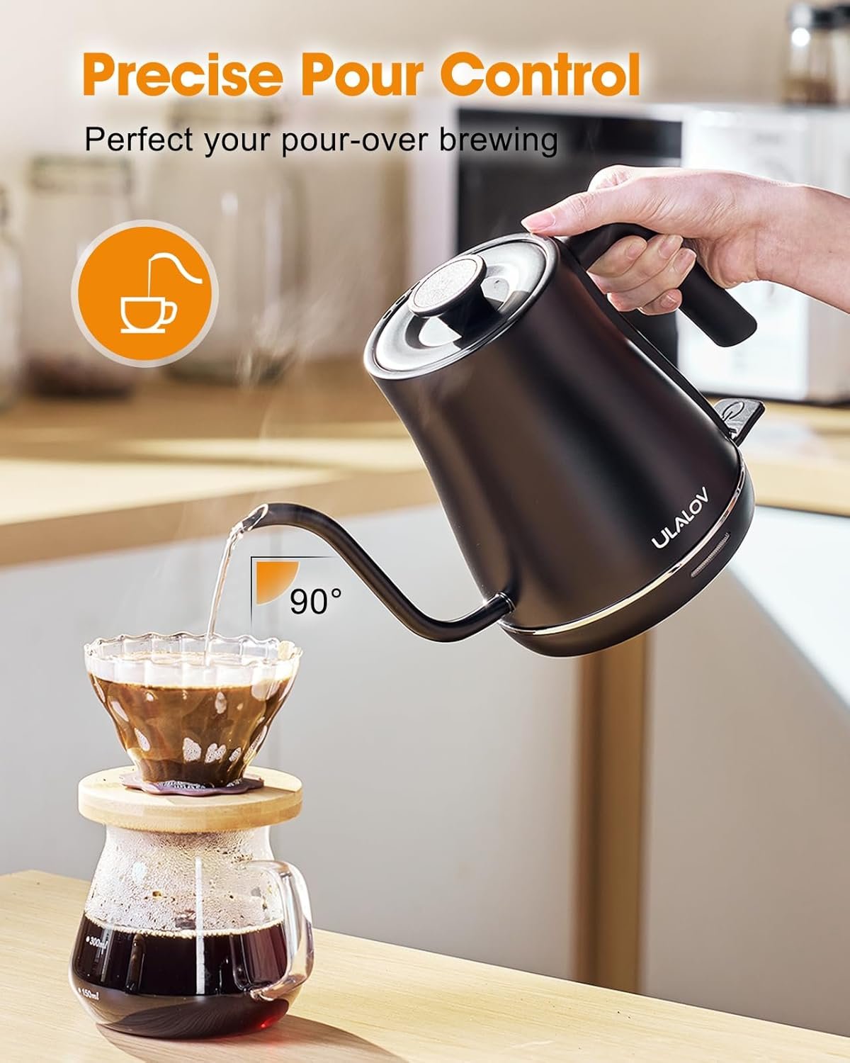 Ergonomic Design with Counterbalanced Handle: The gooseneck kettle features a counterbalanced handle, perfectly designed to provide better control; This balanced grip ensures a smooth, steady pour, giving you comfort for perfect coffee extraction every time