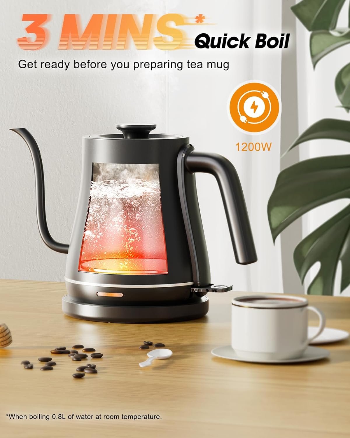 Fast Boil: An energy-efficient 1200-watt kettle heats 1L(33.8 oz) of water in just 4 minutes, so your water is ready by the time you’ve finished grinding your coffee or prepping your tea mug; enjoy brewing without the wait