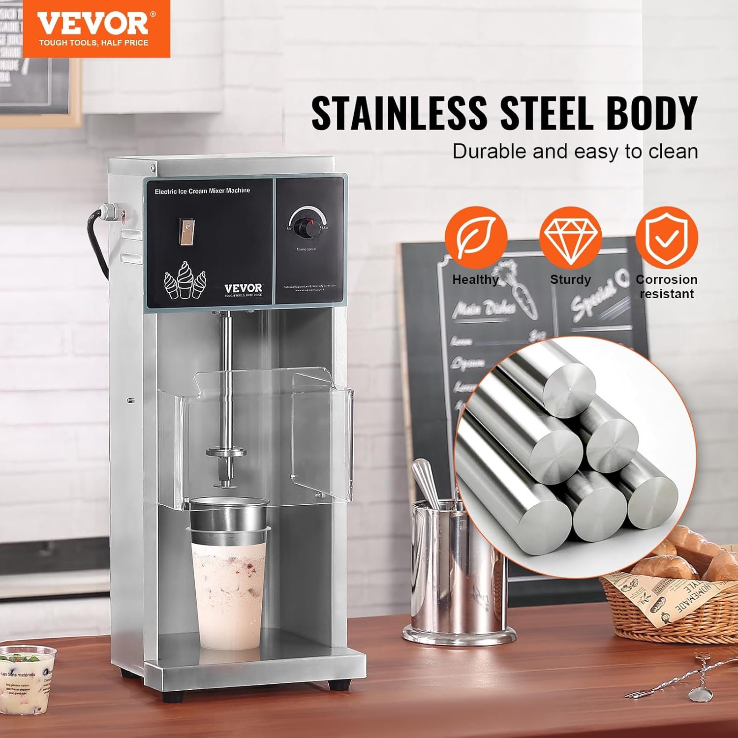 Full Stainless Steel Construction: Constructed from durable 304 stainless steel, both the body and mixing head feature seamless welding technology for enhanced durability, easy cleaning, and robustness. Large side ventilation holes ensure efficient heat dissipation, extending the machine’s lifespan during long-term use.