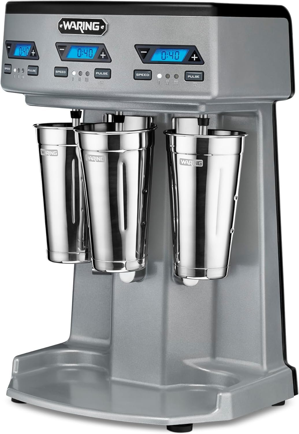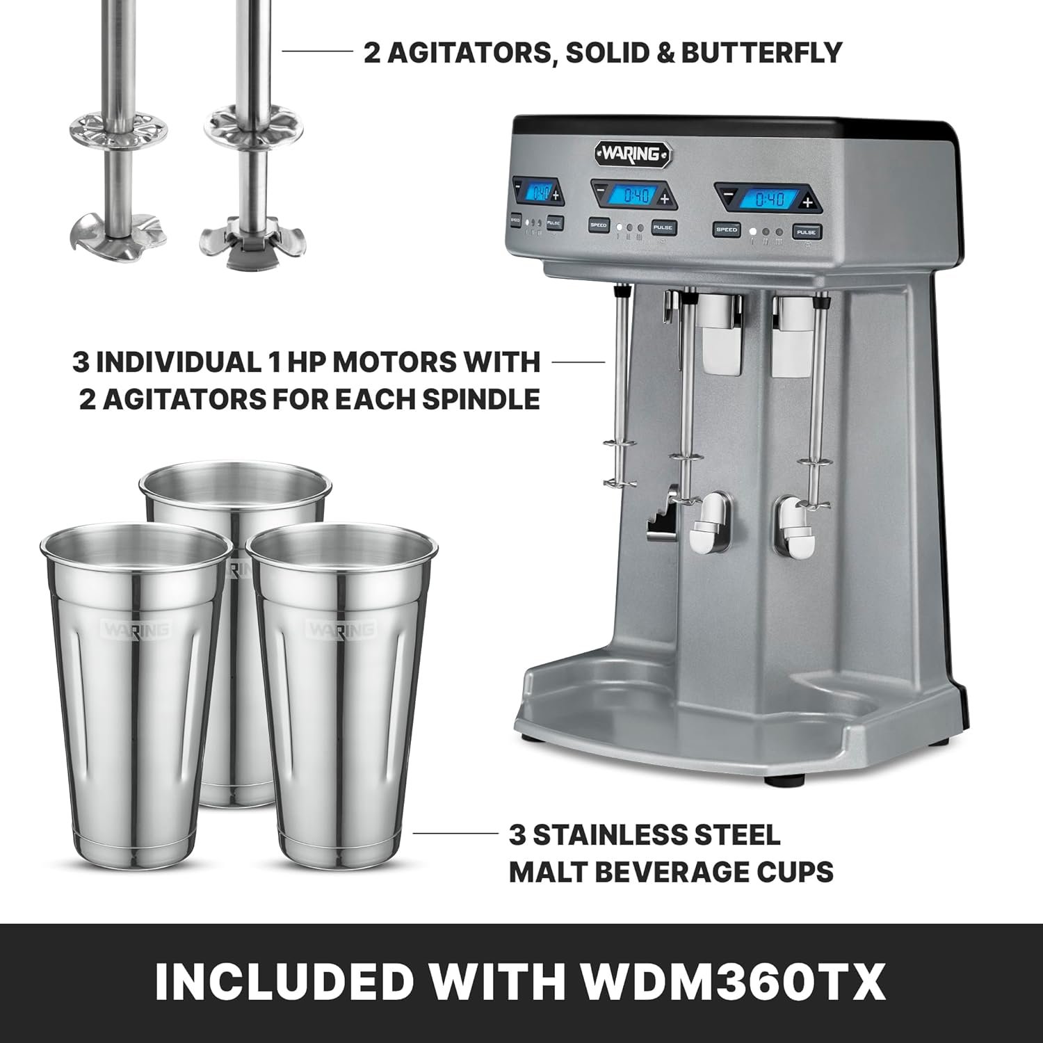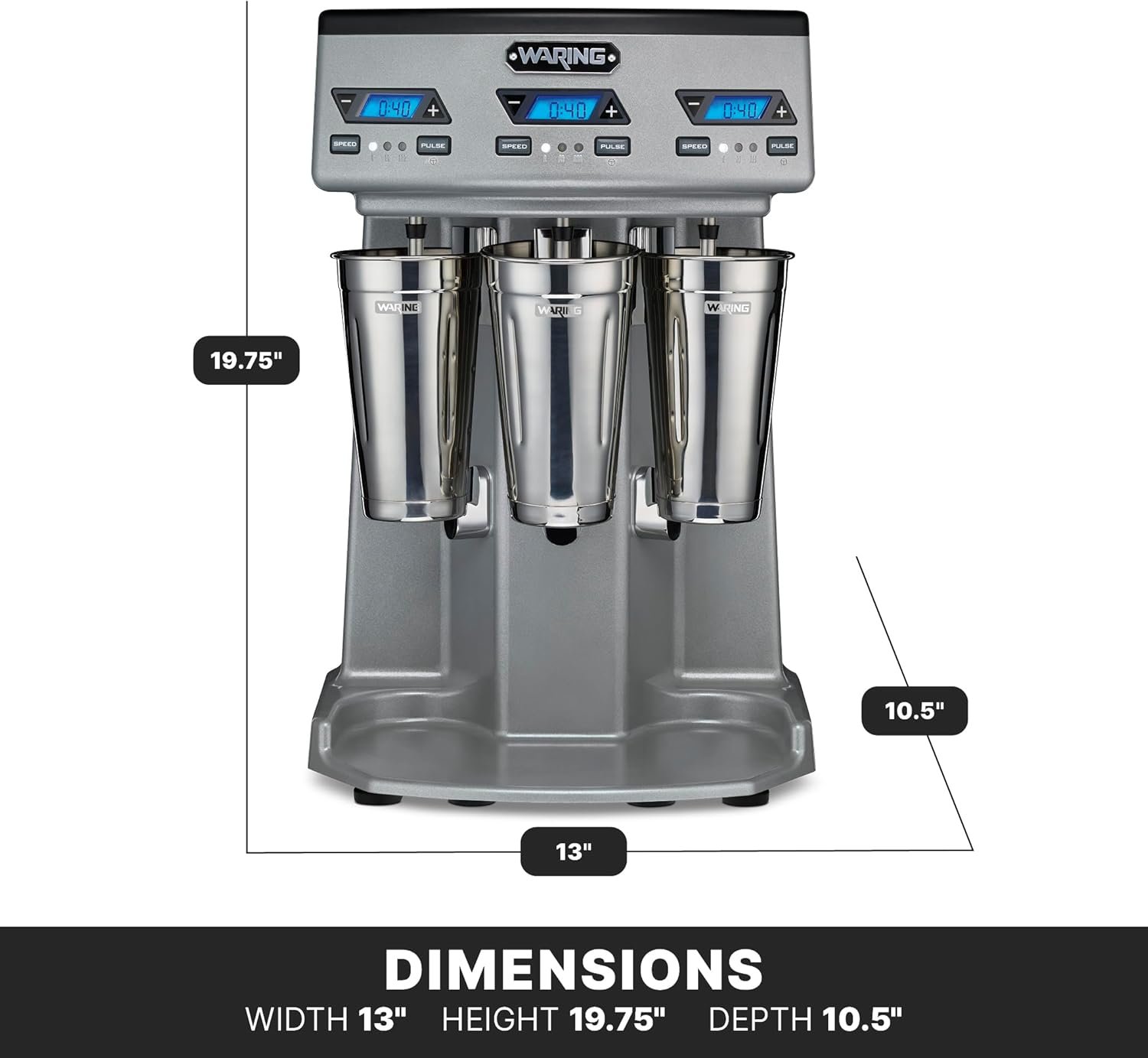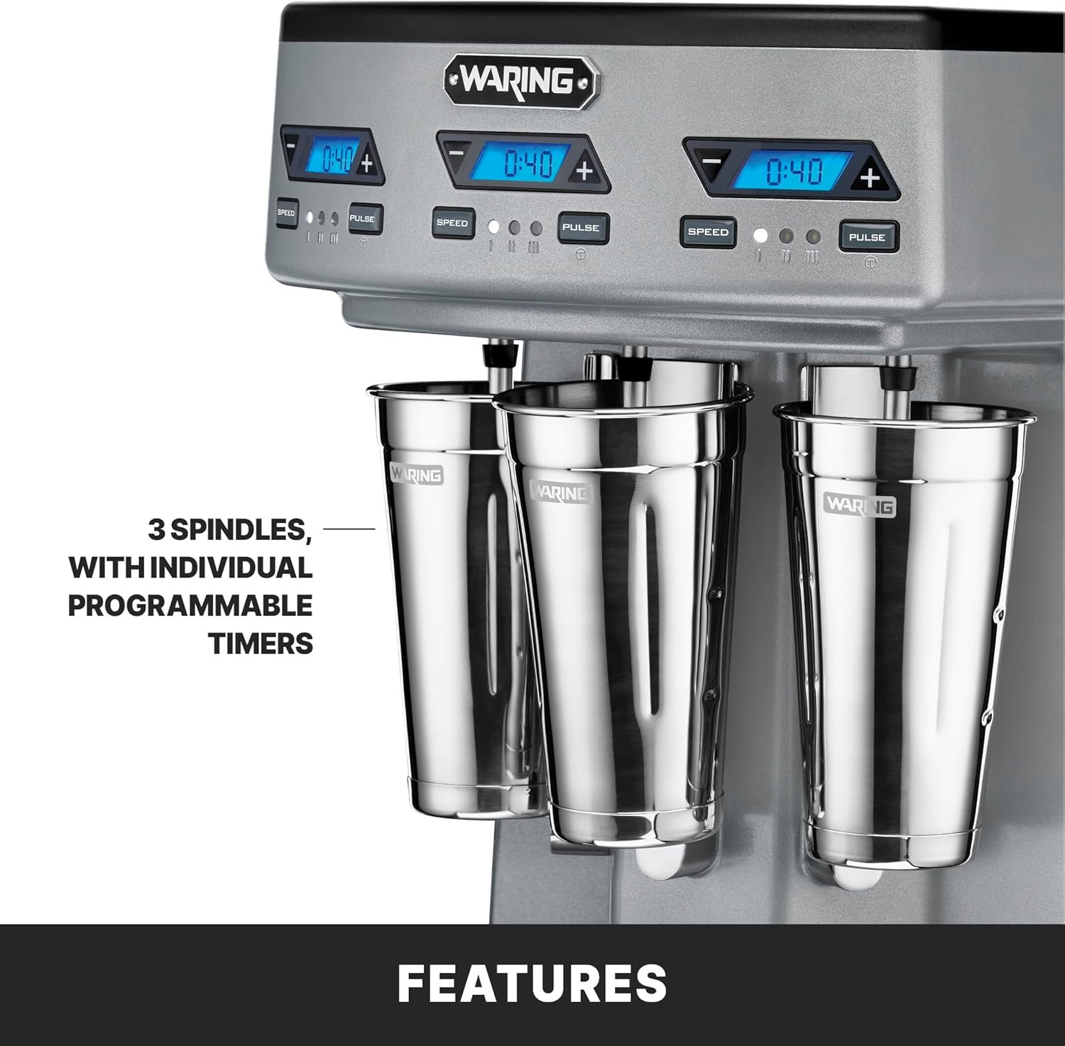 Waring Commercial WDM360TX Heavy-Duty Triple Spindle Drink Mixer, Each Spindle Has Independent 1hp Motor, with Countdown Timer, Digital Display, Automatic Start/Stop, 120V, 5-15 Phase Plug,Silver